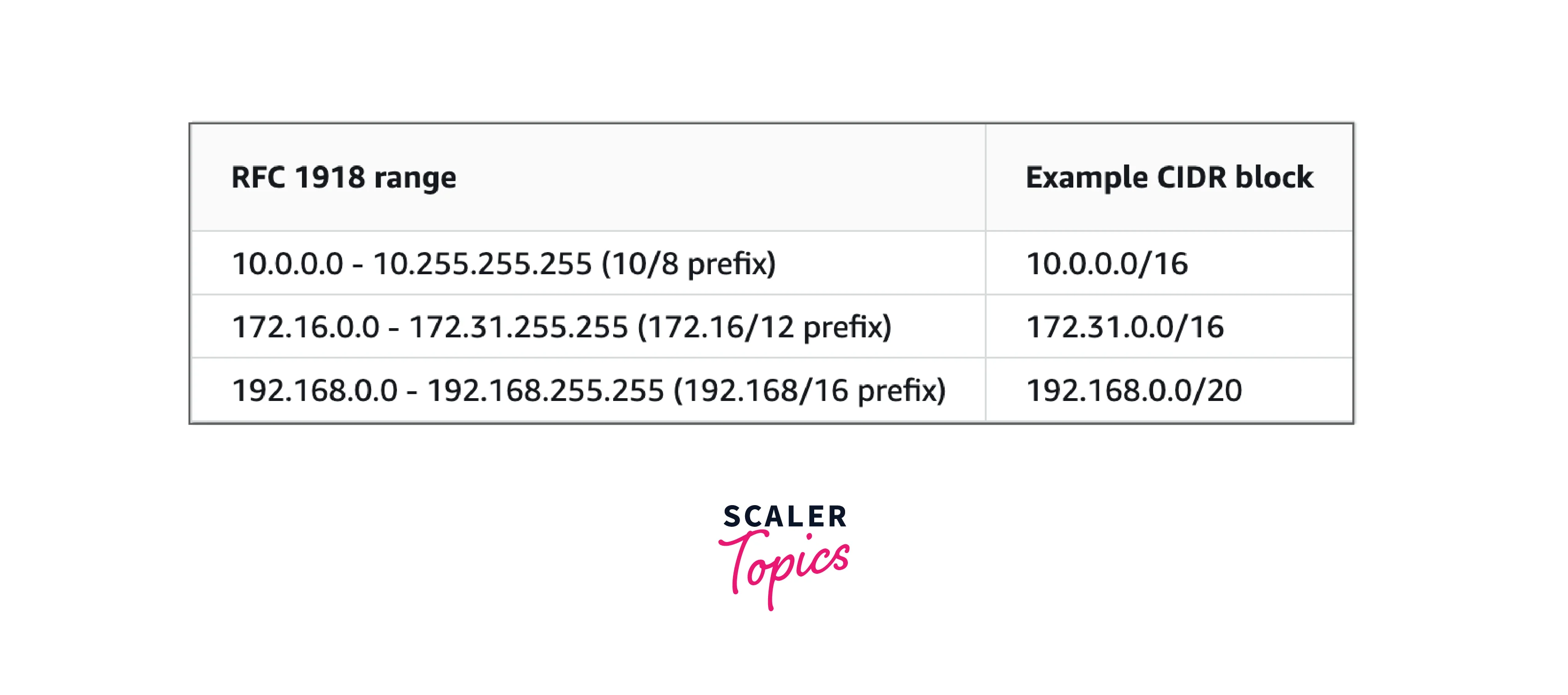 When you create a VPC, you must specify a range of IPv4 addresses for the VPC in the form of a CIDR block. AWS recommends specifying a CIDR block from the private IPv4 address ranges as specified in RFC 1918.