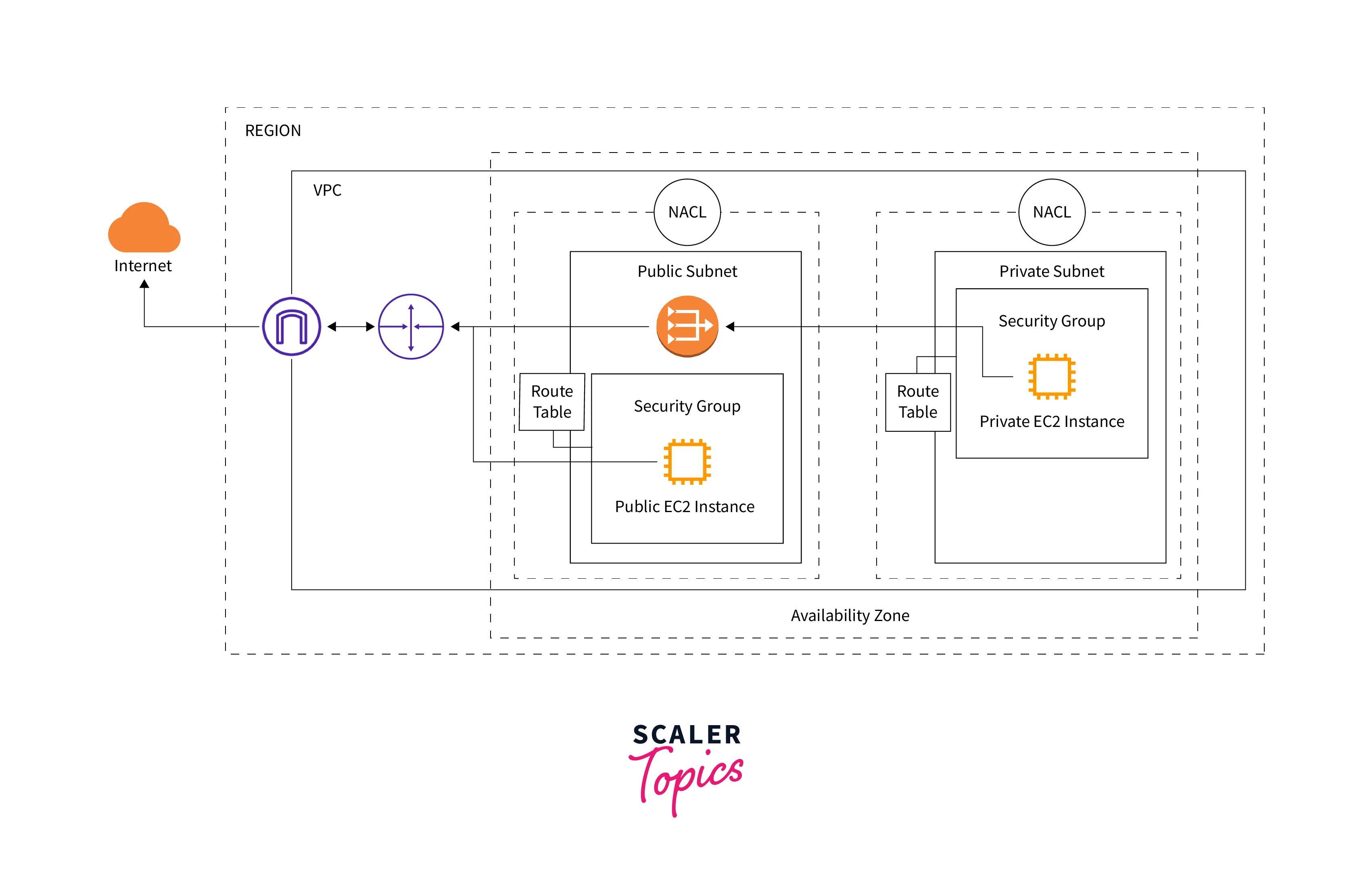 The outer box represents an AWS Region and inside the region, a Virtual Private Cloud (VPC) will be created. This VPC will be created in an availability zone (Availability zones are the distinct locations within AWS Regions which are highly available data centers that provide scalability, reliability, and disaster recovery) corresponding to the particular region. In the VPC, there are two subnets defined - one public subnet, and one private subnet. EC2 instances are launched in each of the subnets. Here separate subnets are used for unique routing requirements. Public subnets are used for external-facing resources and private subnets are used for internal resources. The EC2 instance in the public subnet is accessible over the internet whereas the instance in the private subnet cannot access the internet on its own. Note that to connect to the Internet, place an Internet Gateway (IGW) inside the VPC and add a route to the public subnet's route table (Destination as 0.0.0.0/0 with the target as Internet gateway) that directs internet-bound traffic to the Internet gateway.