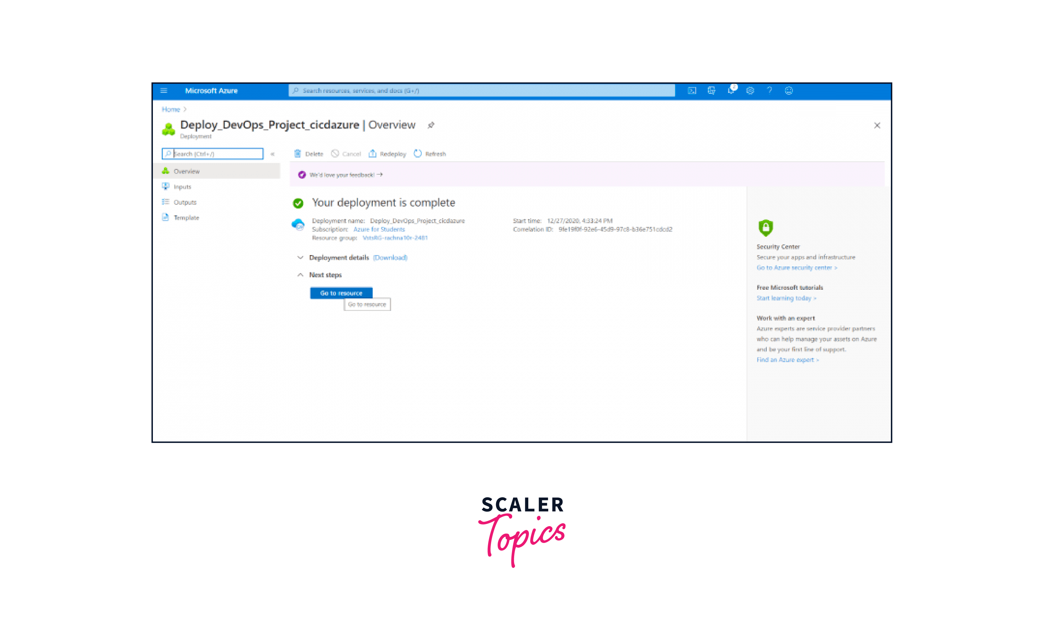Project Creation and Resources: The Azure DevOps CI/CD Project will be established. The Azure resources panel might take a few moments to load. This project's creation encompasses: