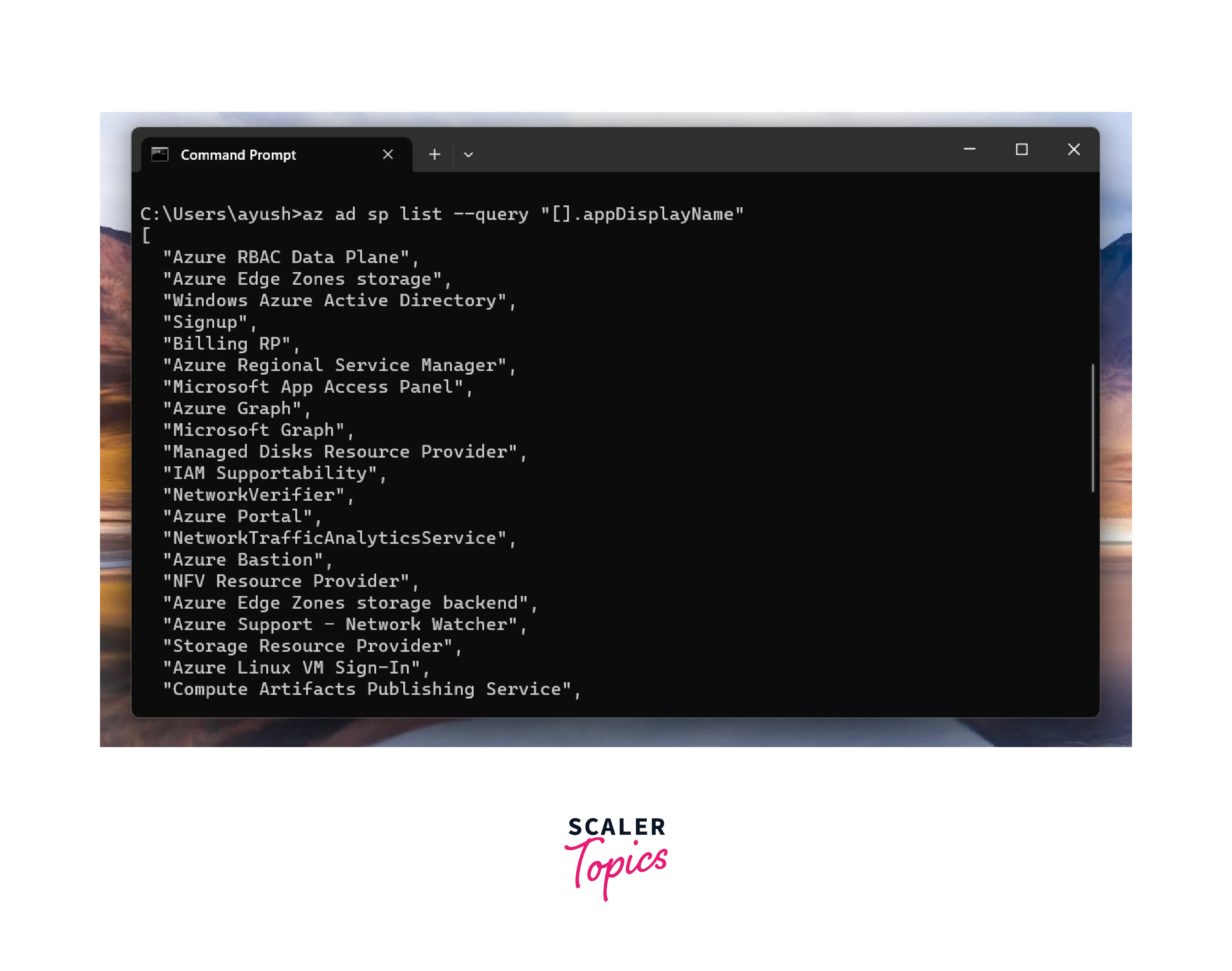 az ad sp list --query "[].appDisplayName" : This can be useful to get a list of application display names associated with the service principals.