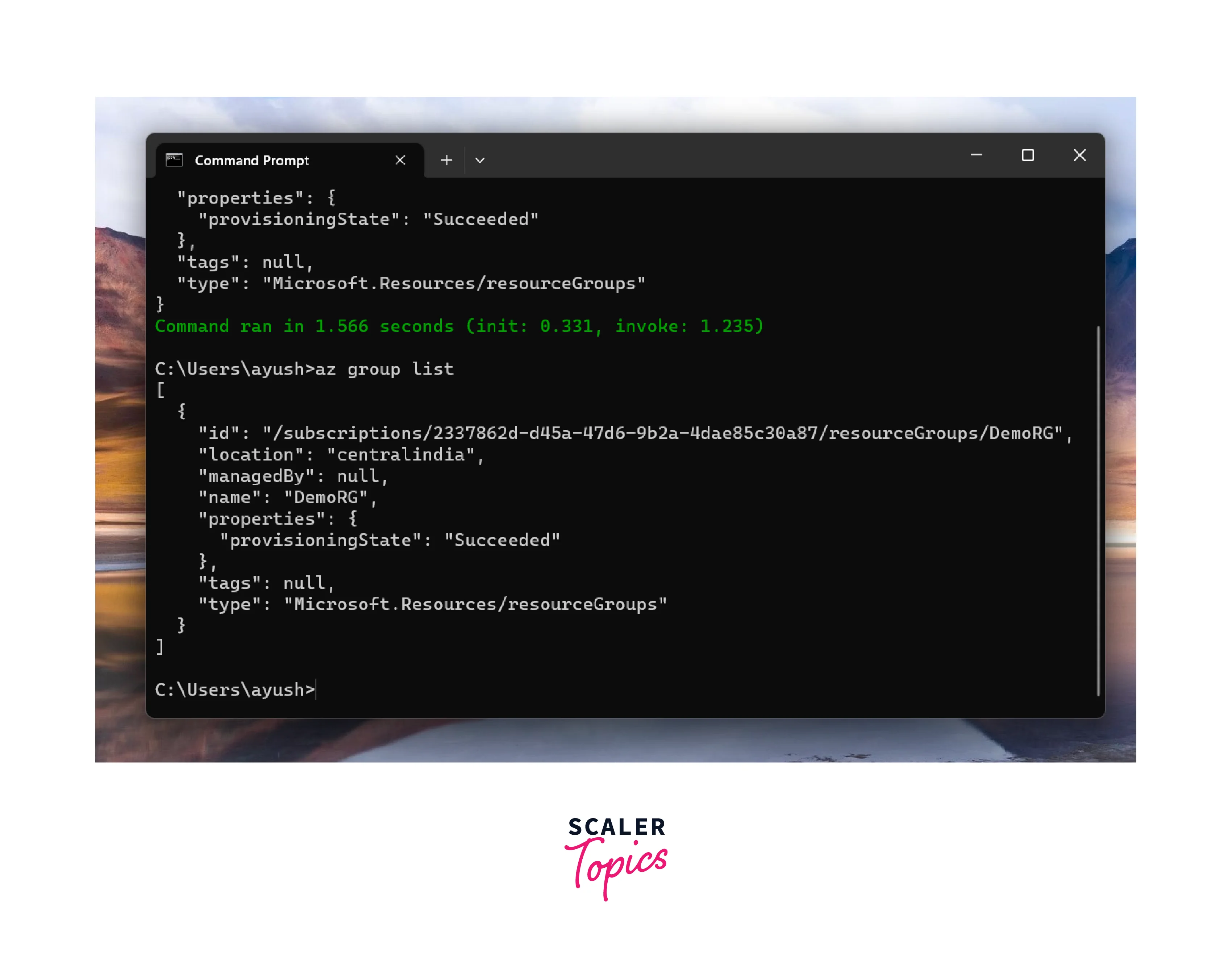 - To create a resource group, use the command az group create. The --query parameter is used with queries to filter and format output.