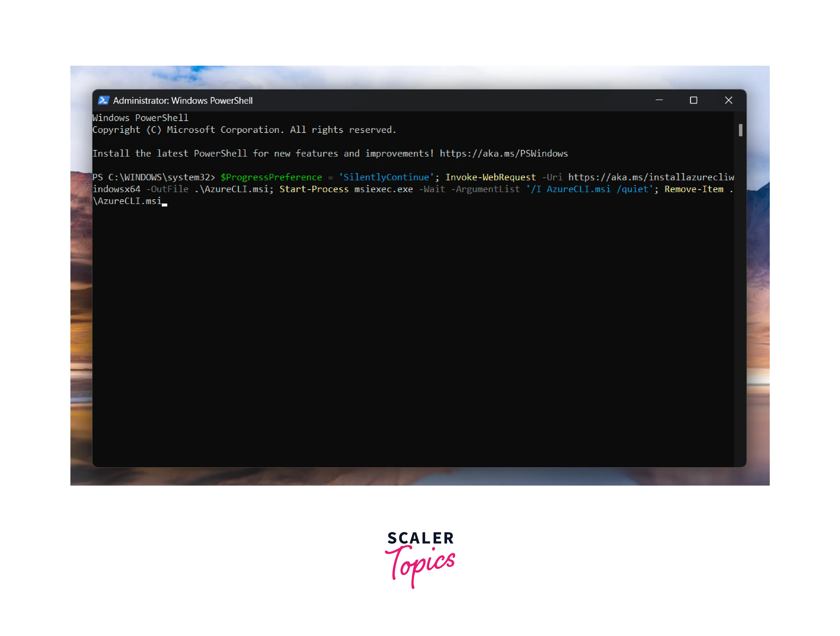 Open windows powershell with administrative access and the following given command. $ProgressPreference = 'SilentlyContinue'; Invoke-WebRequest -Uri https://aka.ms/installazurecliwindowsx64 -OutFile .\AzureCLI.msi; Start-Process msiexec.exe -Wait -ArgumentList '/I AzureCLI.msi /quiet'; Remove-Item .\AzureCLI.msi