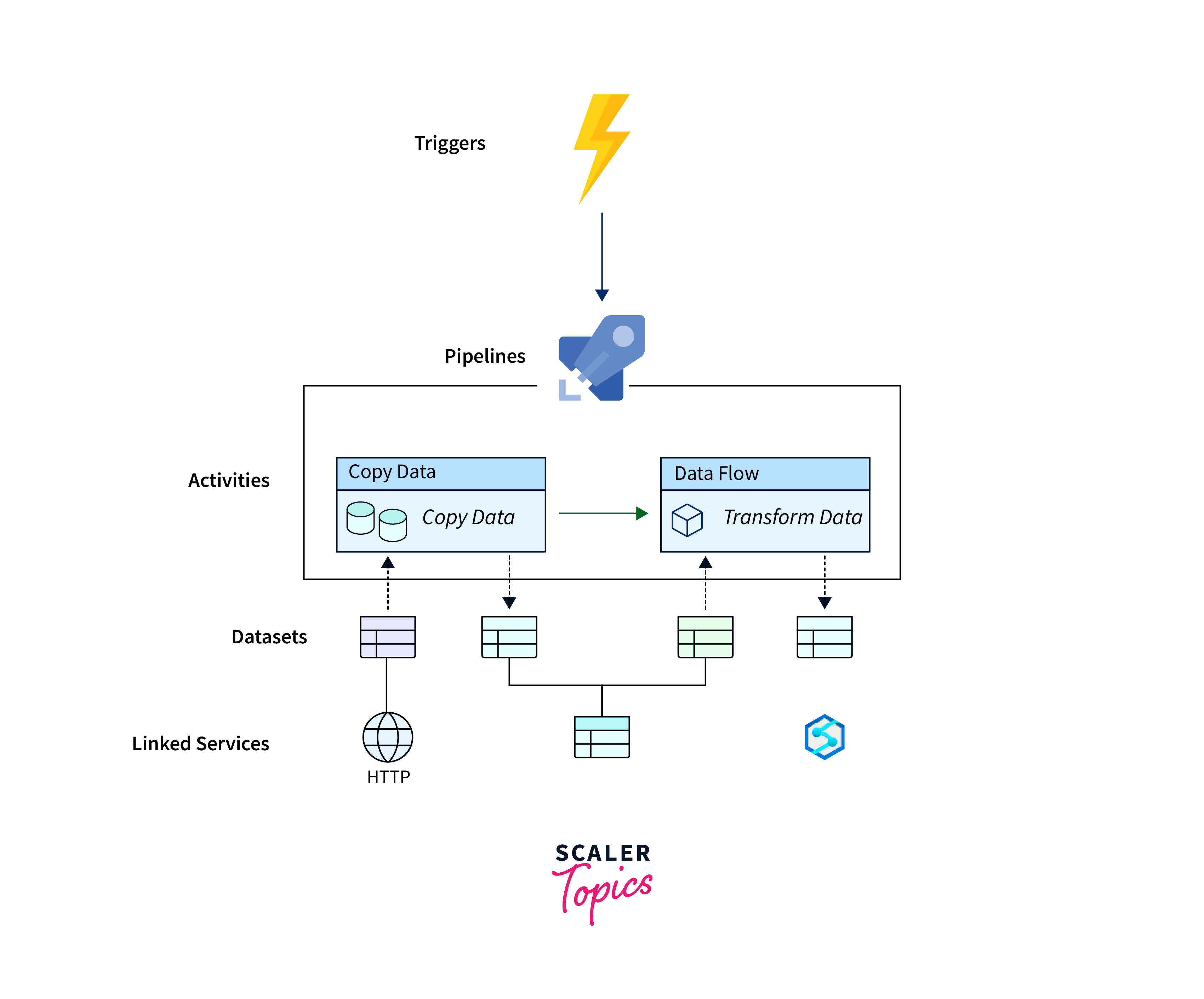 - When a trigger is activated, the pipeline starts executing. Activities within the pipeline interact with datasets and linked services to move and process data.