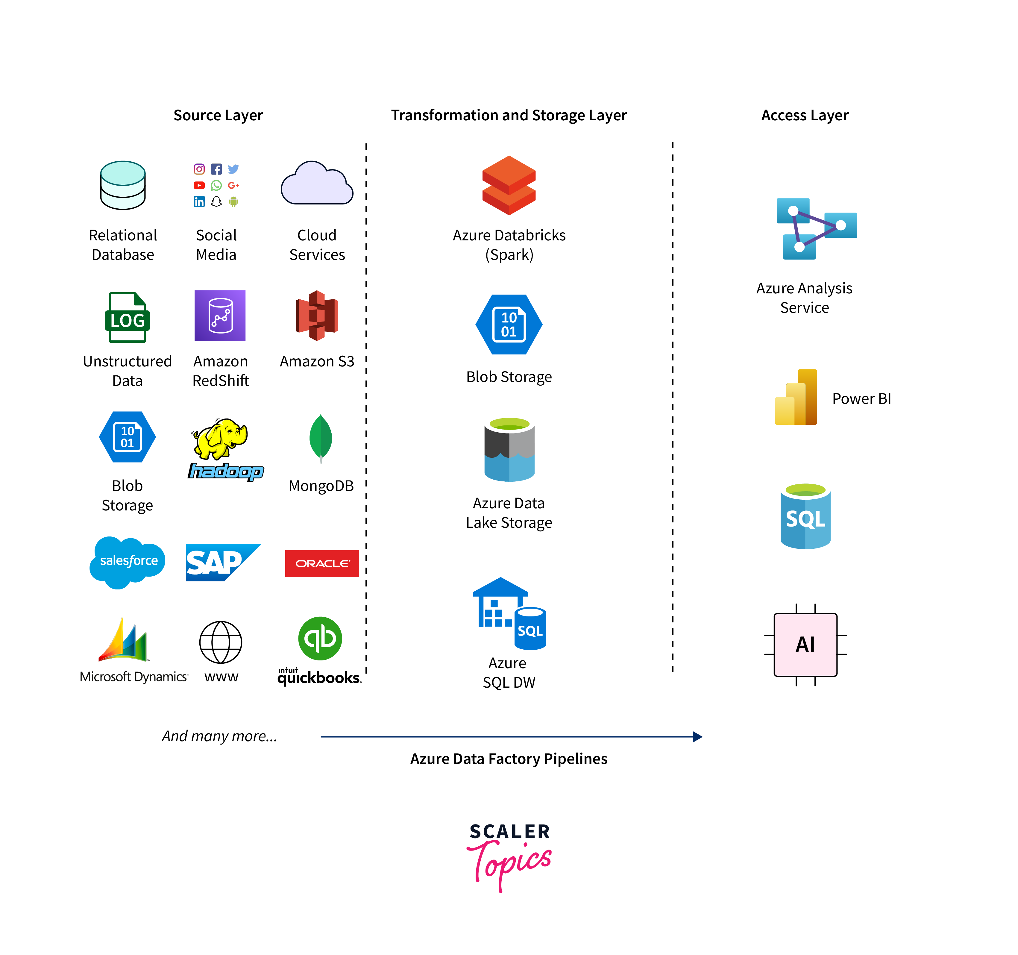 - Use Case: Use Azure Data Factory to orchestrate data movement from Salesforce, Google Analytics, and Azure Storage into a data lake like Azure Data Lake Storage. You can then use Azure Synapse Analytics (formerly Azure SQL Data Warehouse) or Azure Databricks to analyze and gain insights from the consolidated data.