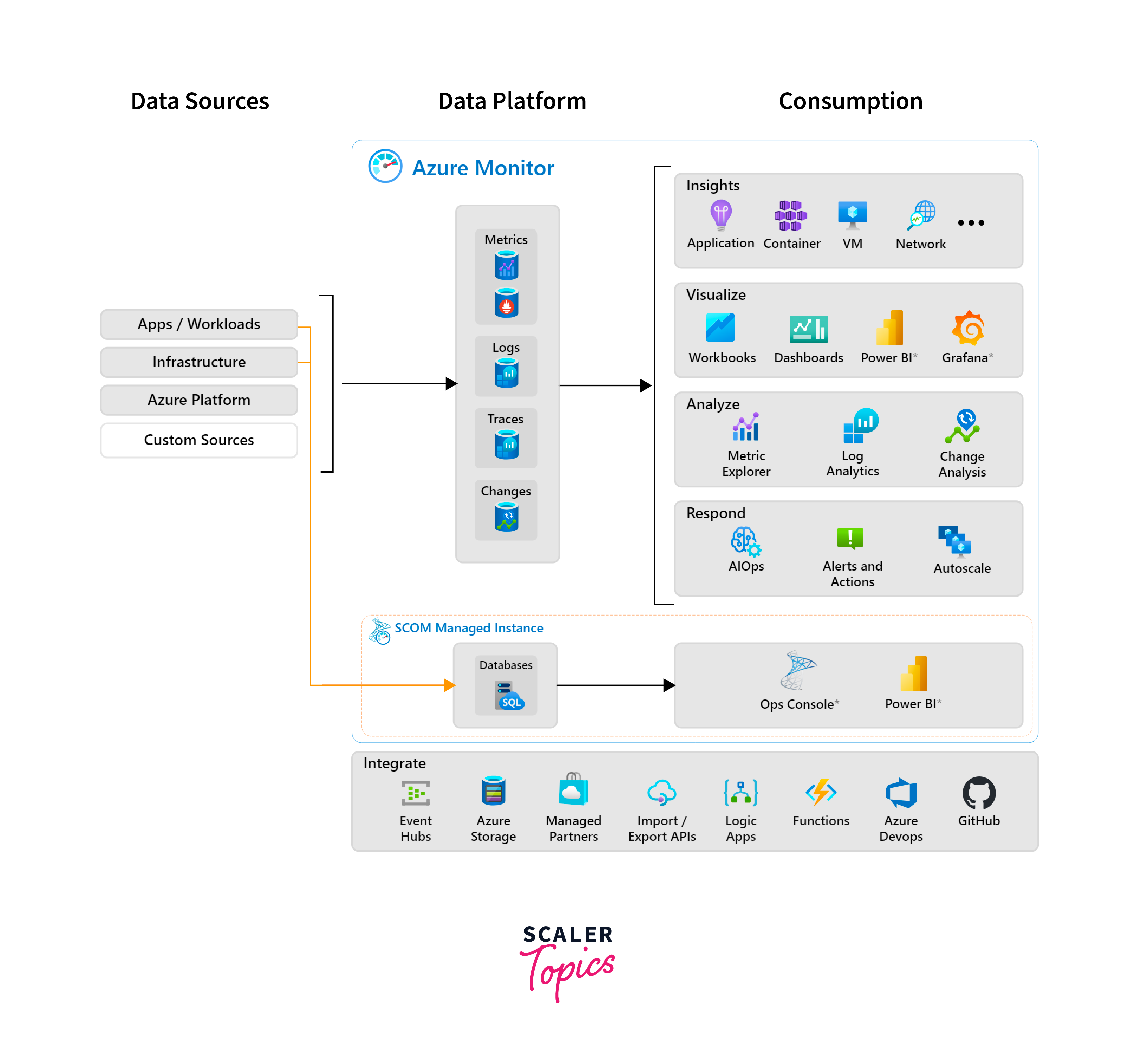 The collected monitoring data is ingested into Azure Monitor, where it is stored and processed. Azure Monitor leverages services like Azure Log Analytics and Azure Data Explorer to handle large volumes of data and provide efficient storage and retrieval capabilities. - Analytics and Querying: