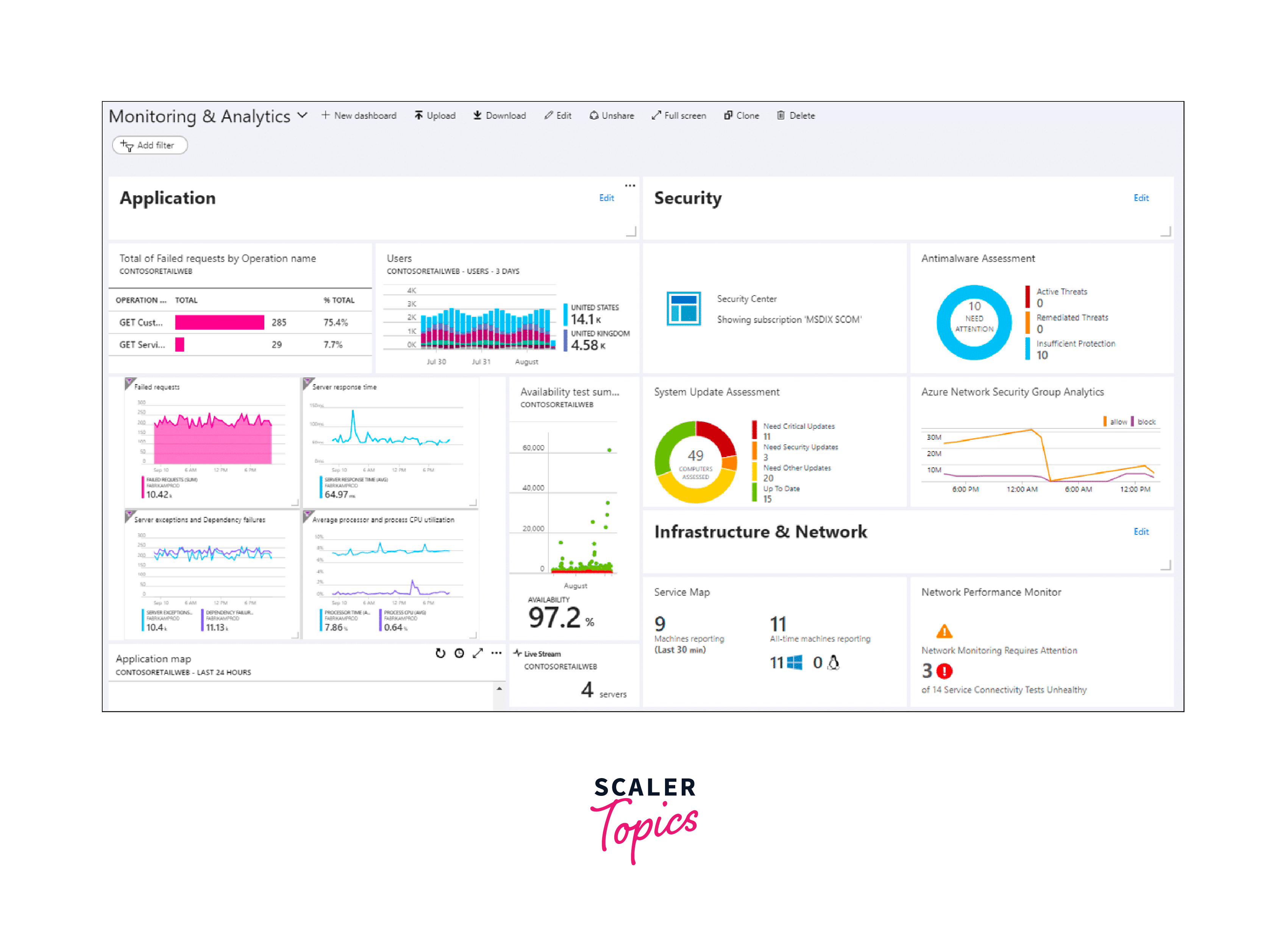 - It provides real-time insights into the performance, availability, and health of cloud workloads.