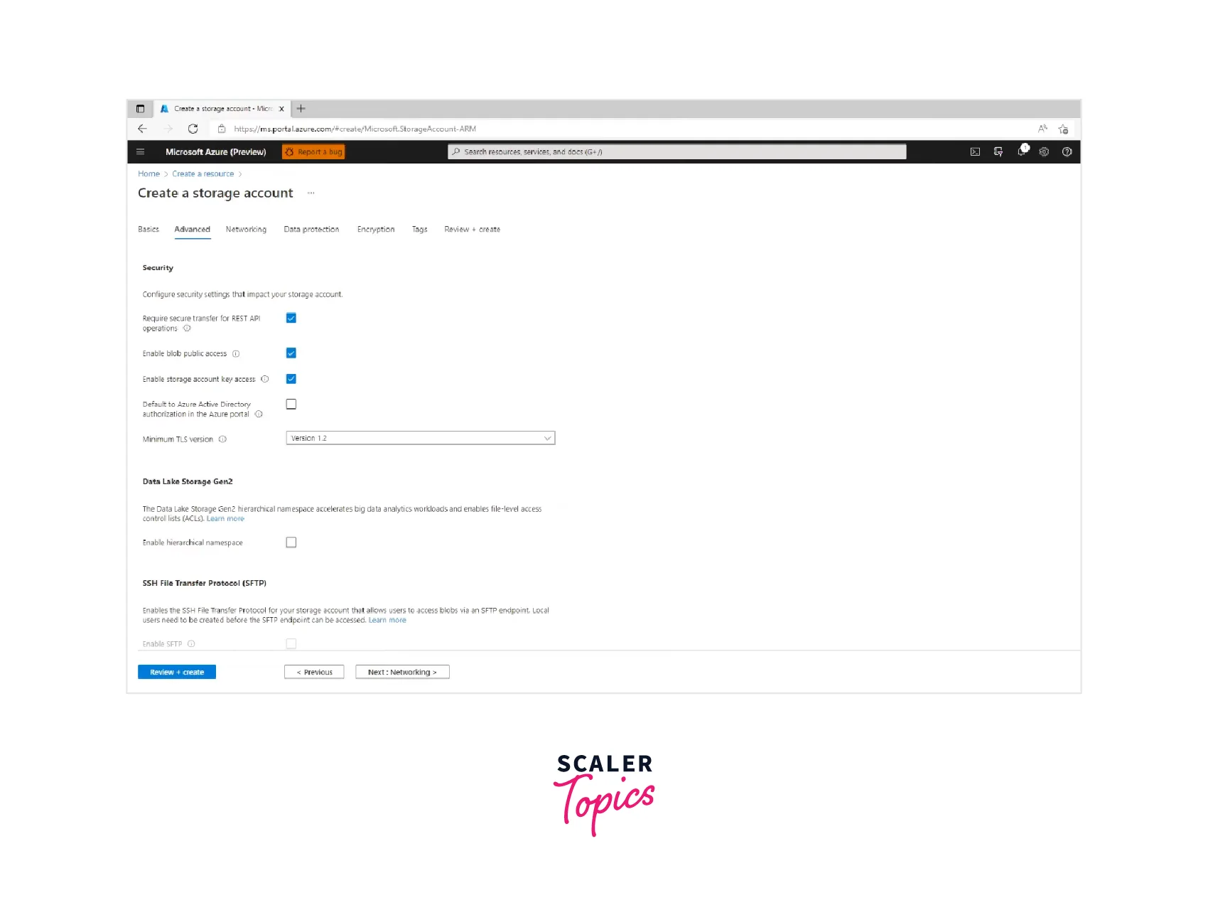 Configure additional settings for your storage account, such as access control, networking, and data protection, according to your requirements.