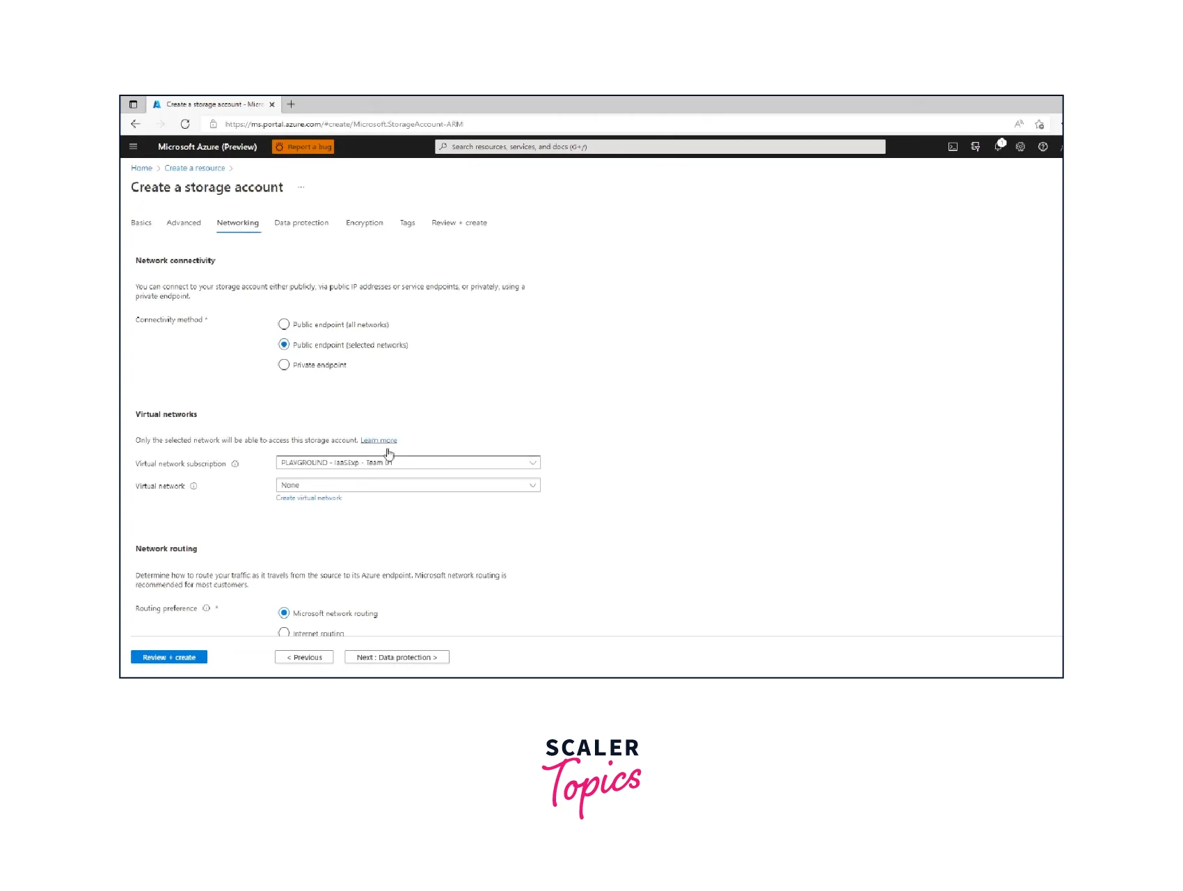 Configure the advanced options, such as access tier, virtual network, encryption, and network routing, based on your specific needs.