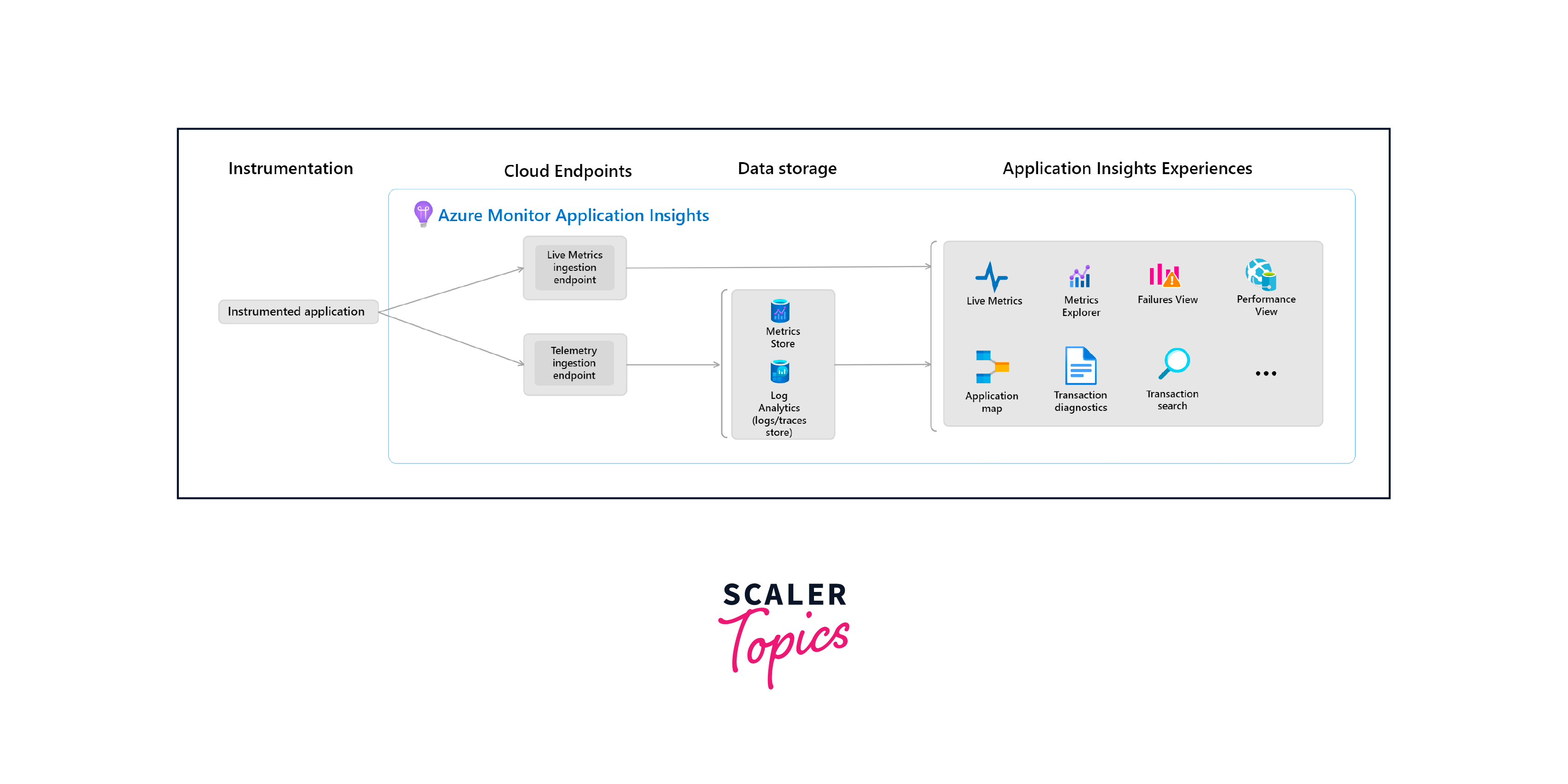 - Azure Application Insights collects and interprets telemetry data from many sources, including as servers, client devices, and cloud services, to give real-time insights via dashboards.