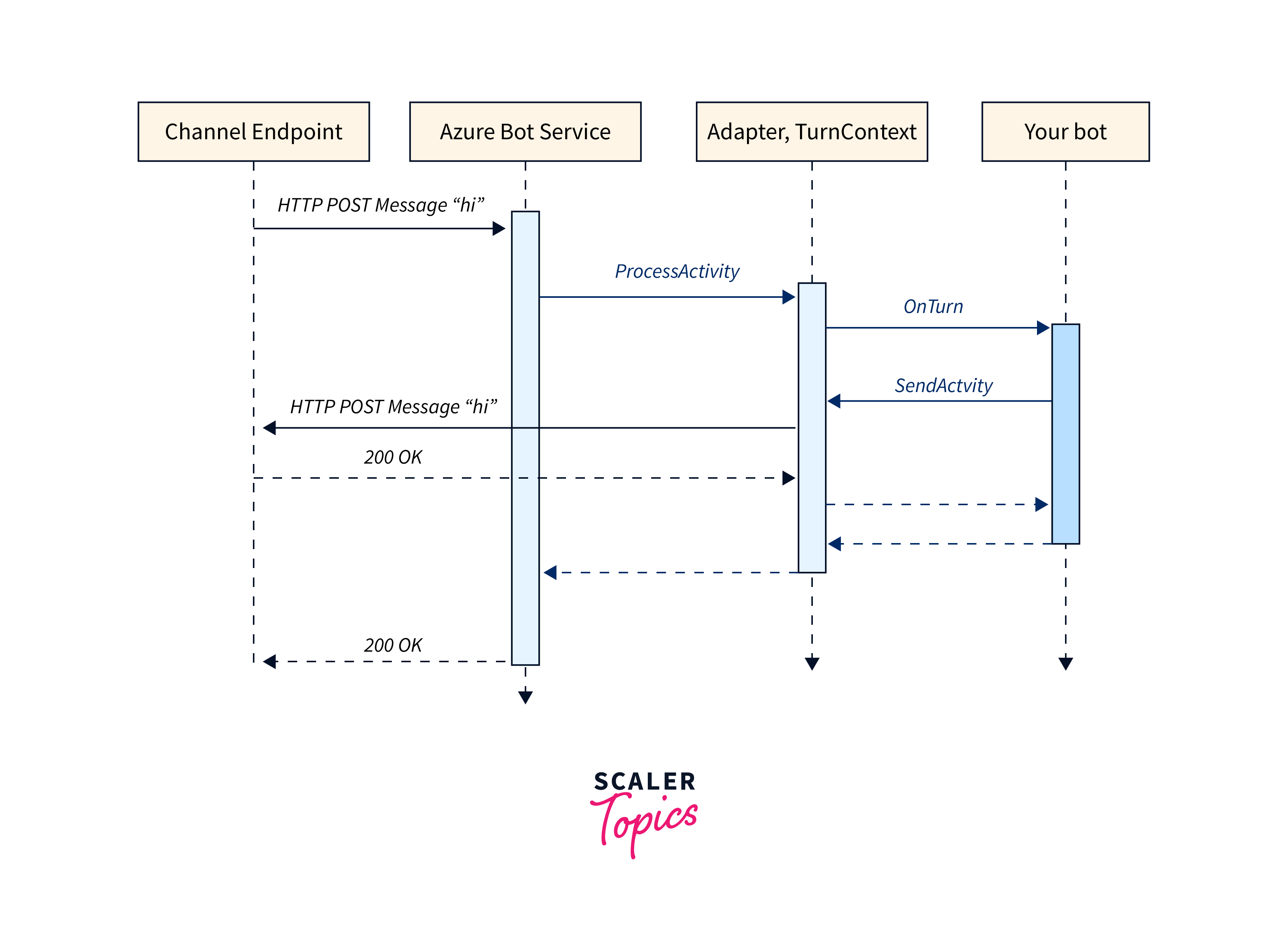 - Inbound Activity: When a user sends a message or interacts with a bot through a messaging channel (e.g., Microsoft Teams, Slack), the channel forwards the user's activity to the Azure AI Bot Service. This service then forwards the activity to the bot's messaging endpoint.