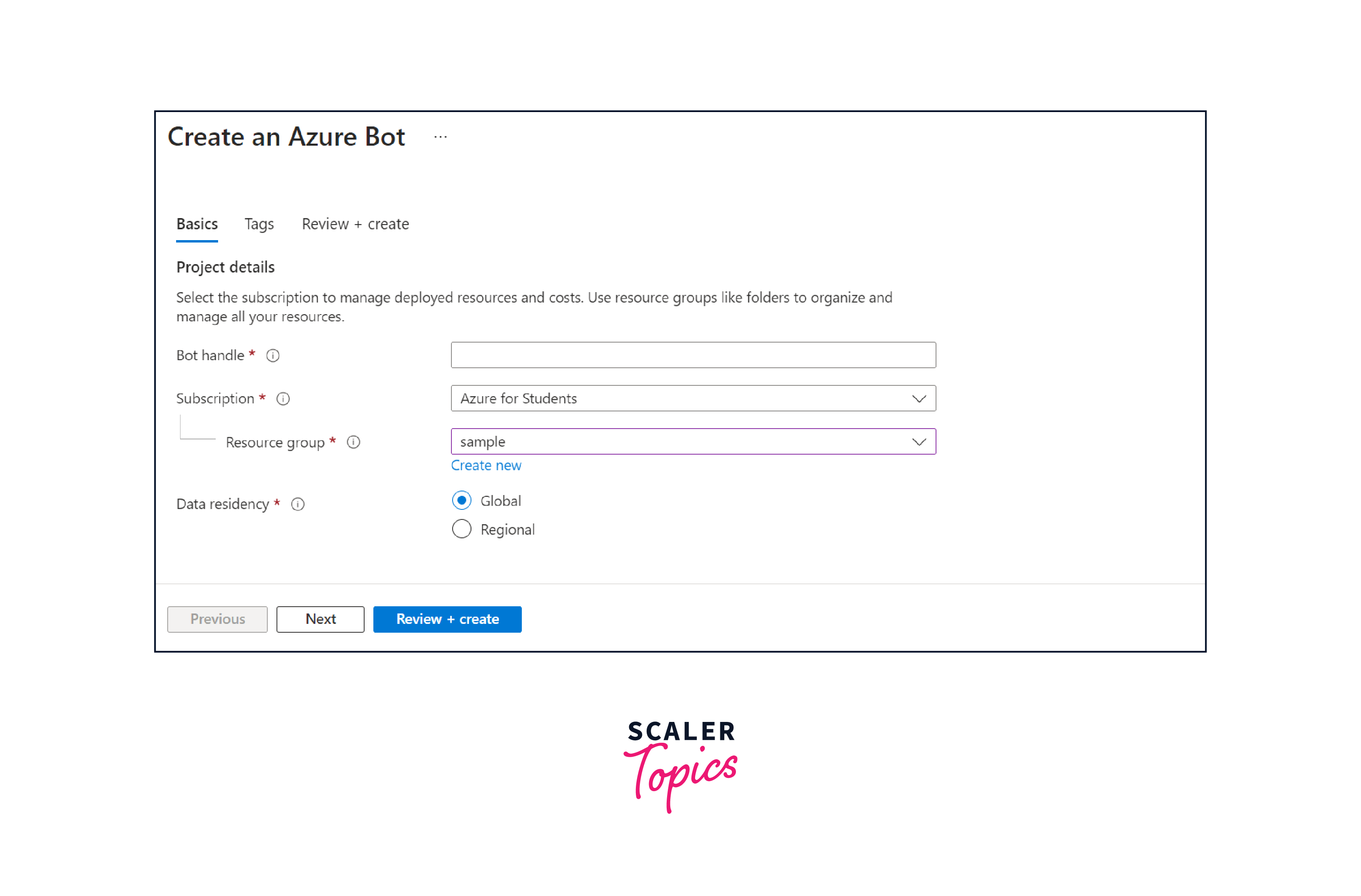 - In the Create Azure Bot page, fill in the details like Bot handle which is a unique name for your bot, and also the price tire.