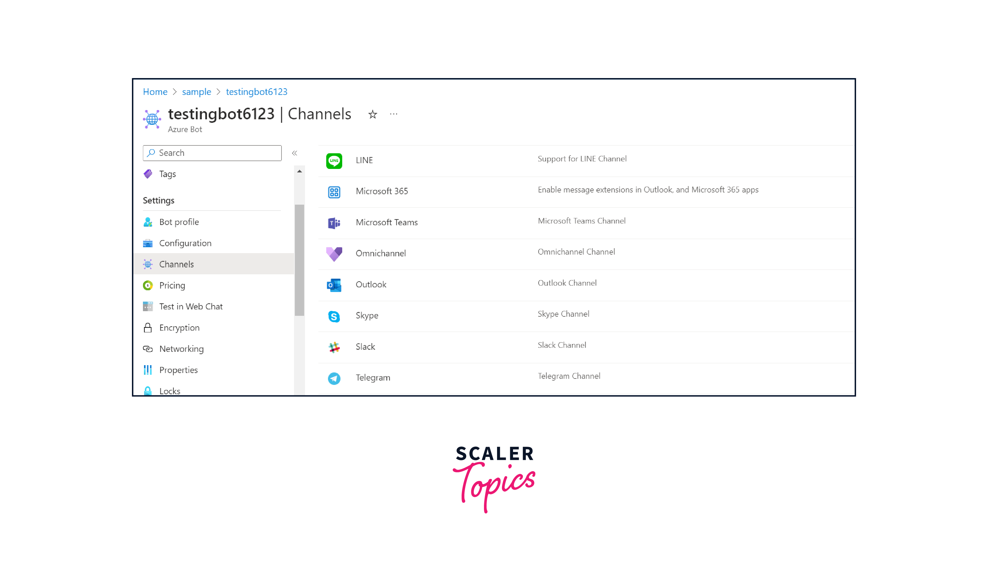 - In the Azure Bot Service portal, navigate to the Channels section. Here, you can connect your bot to various messaging platforms like Microsoft Teams, Slack, Facebook Messenger, and more.