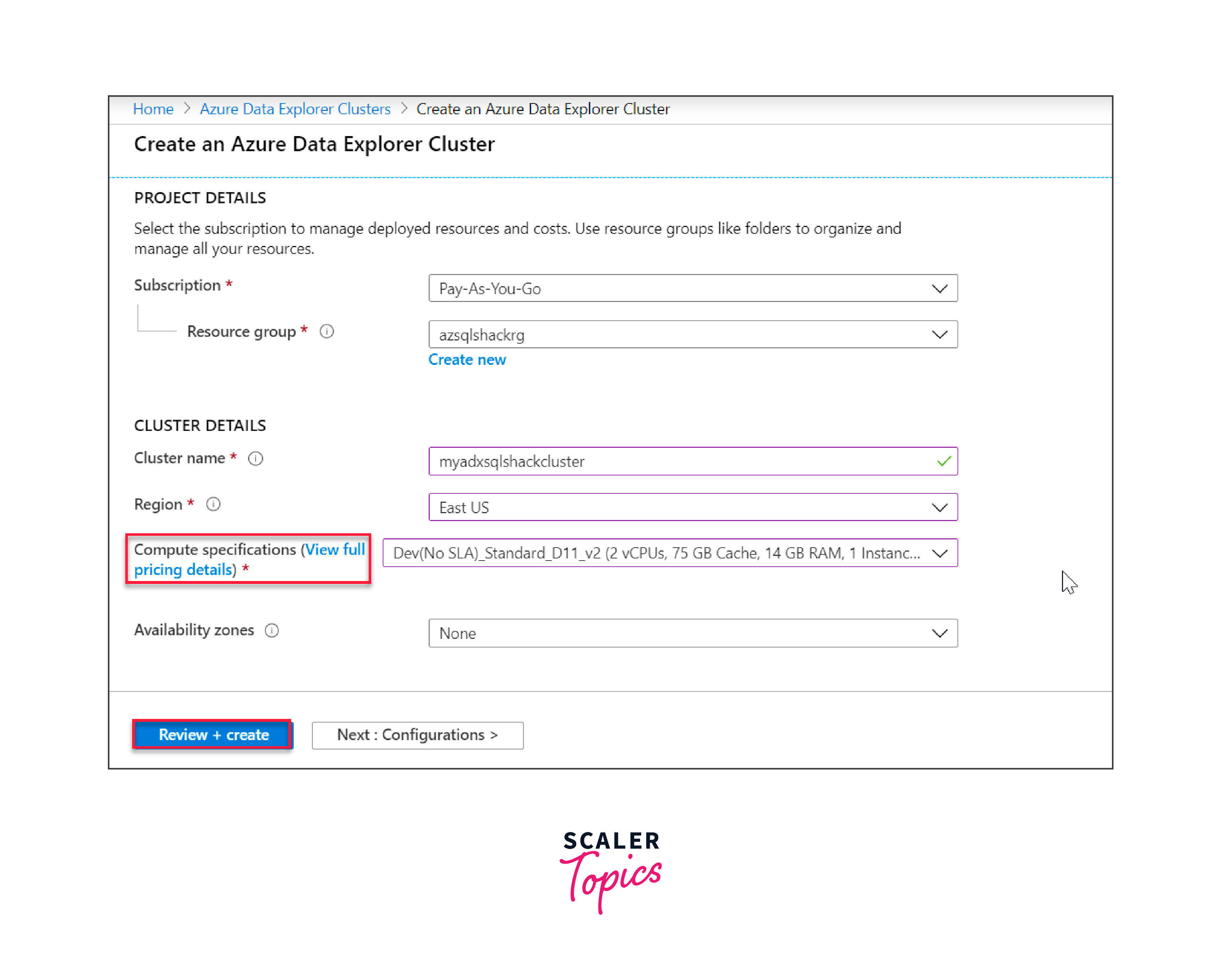 Click on 'Review + create' to inspect the cluster's details and finalize its creation.