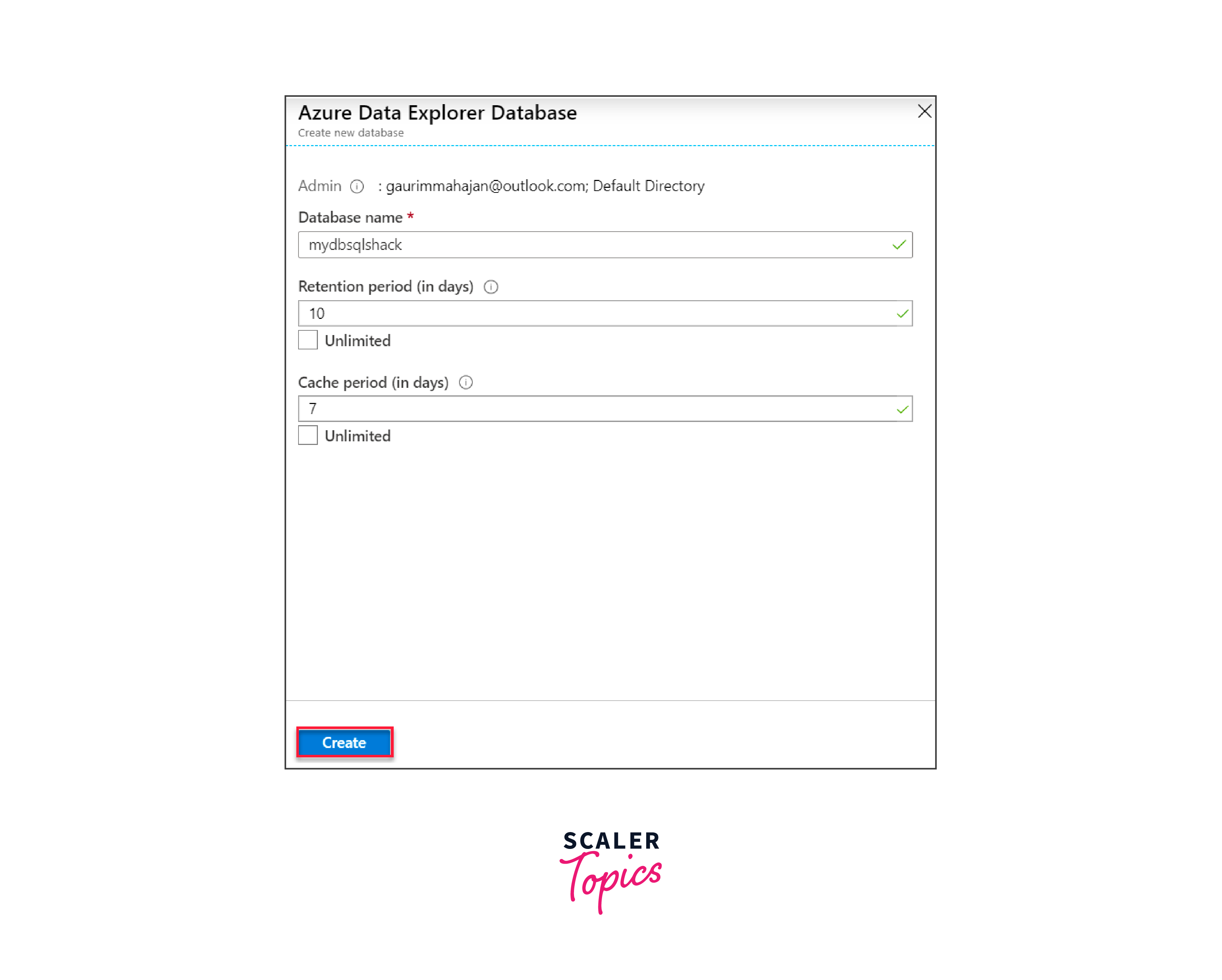 Enter key details for your database: the name, data retention period, and cache duration. ADX offers a unique feature allowing you to determine how long data remains in the cache, a choice between hot or cold storage. Choose the most appropriate settings for your use case.