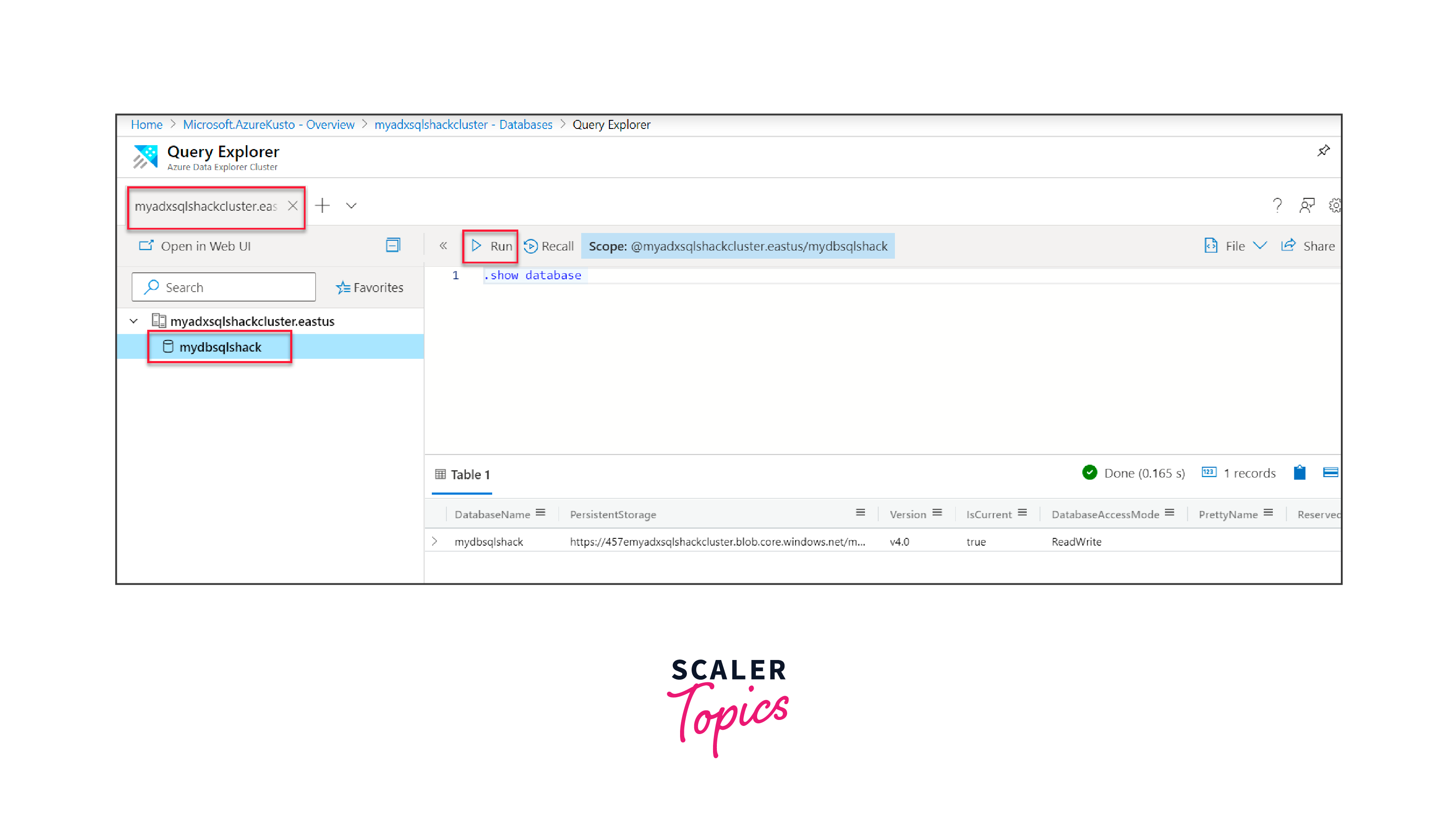 With your cluster and database now ready, enter the database and execute simple commands like ".show database" to retrieve database specifics.