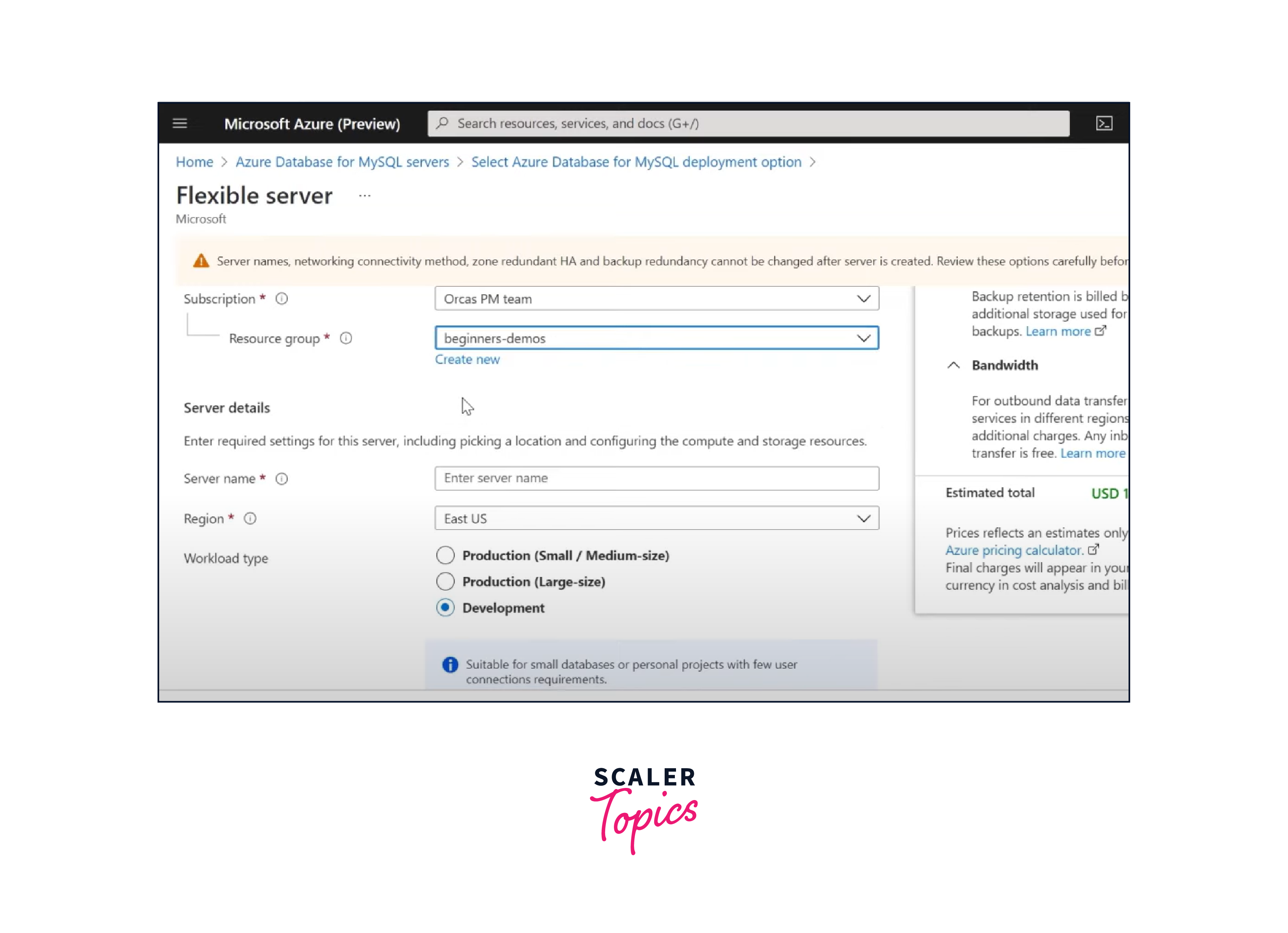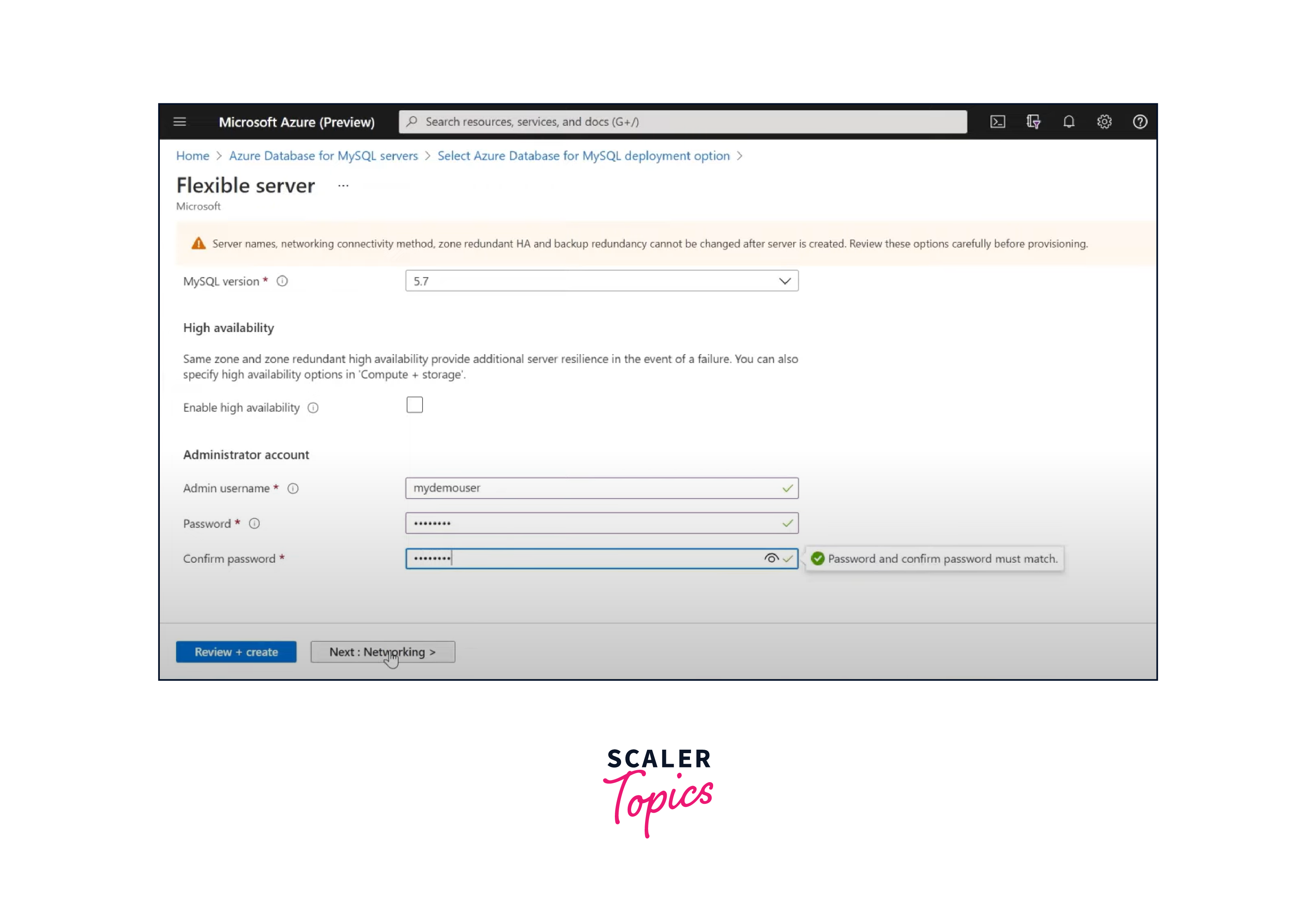 Configure the basic settings for your MySQL database, such as subscription, resource group, server name, region, and pricing tier.