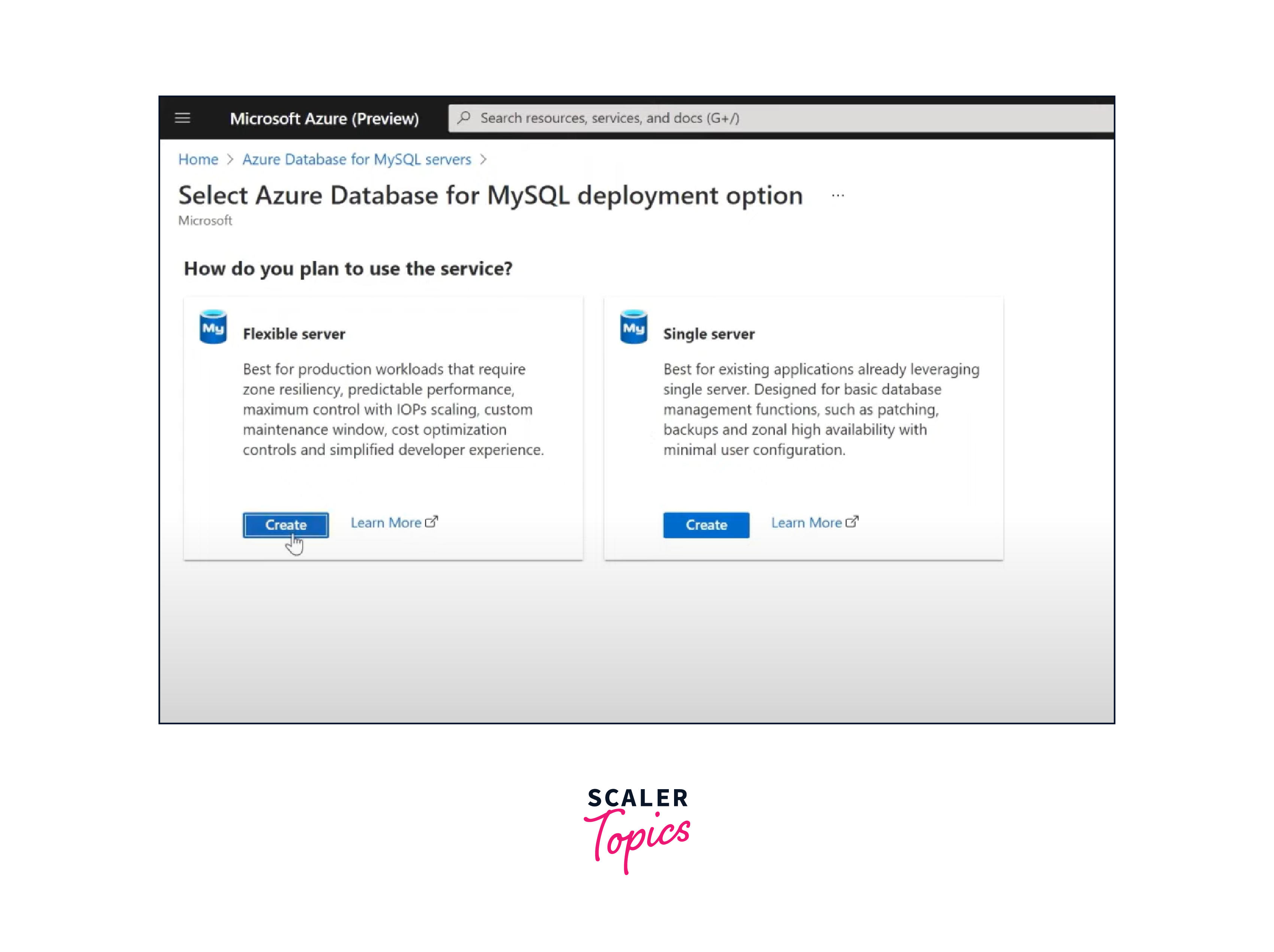 - Search for "Azure Database for MySQL" and select it.