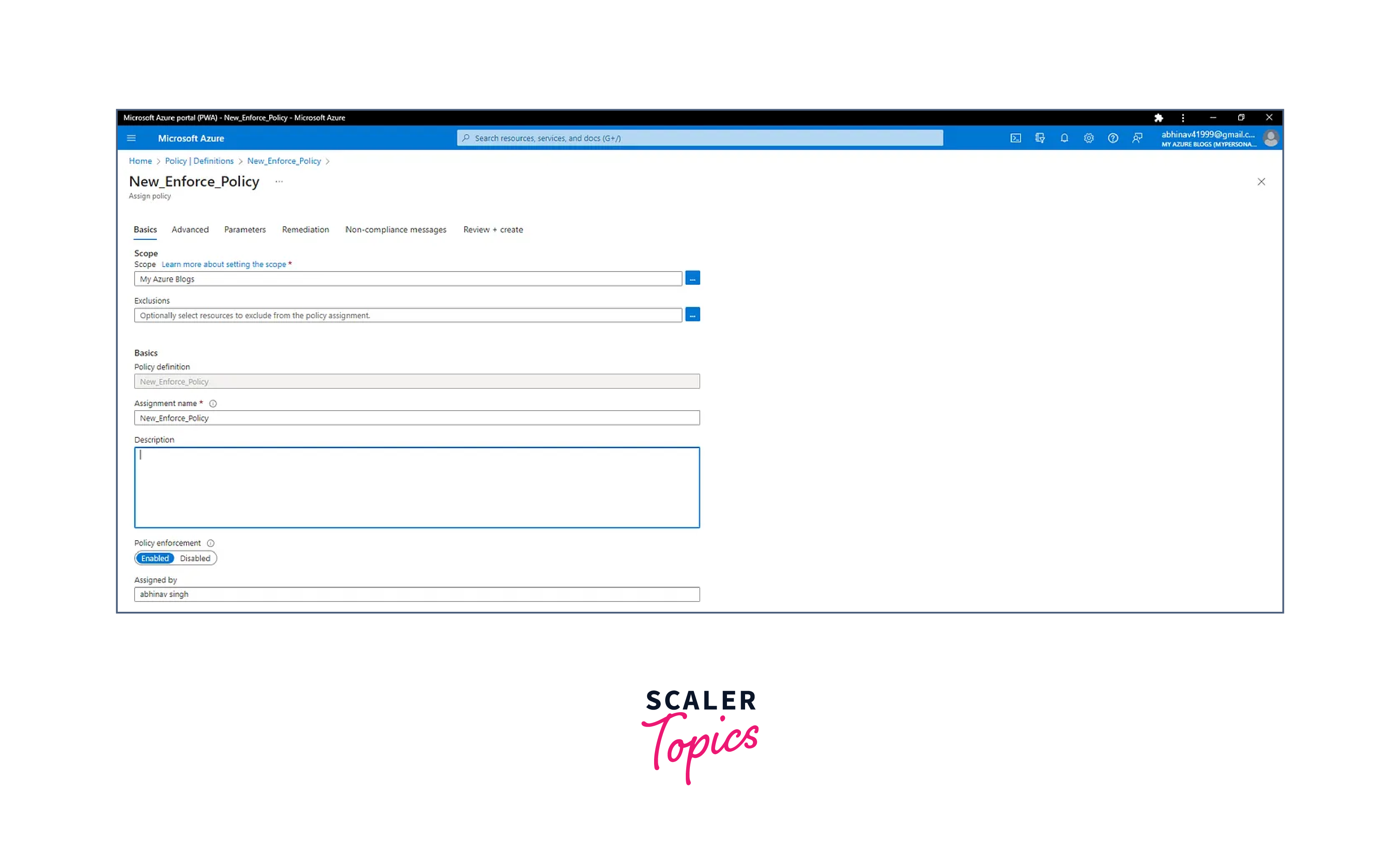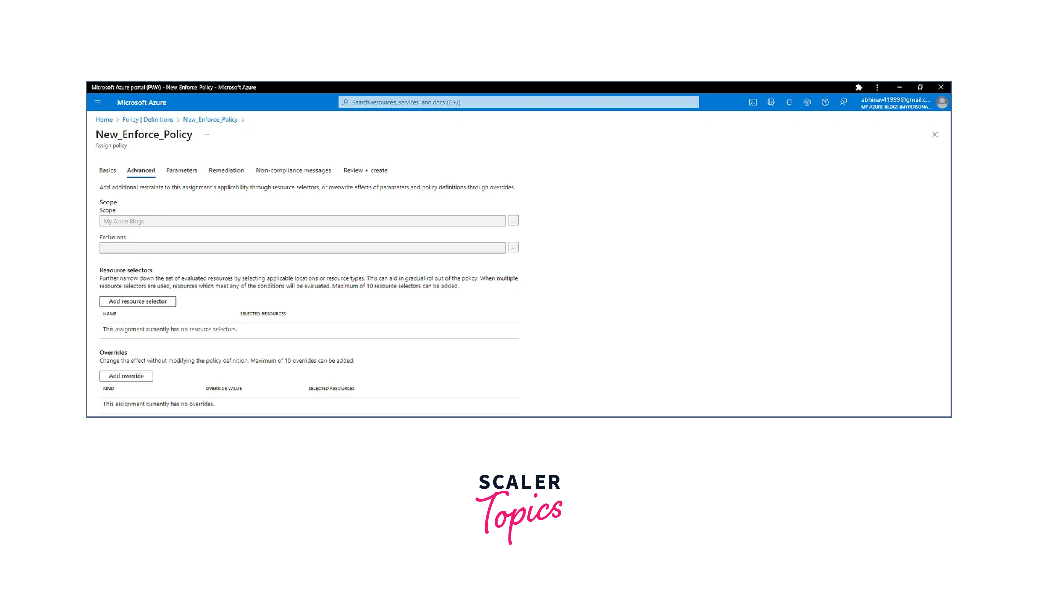 - Specify the scope of the policy (subscription, resource group, or individual resources).