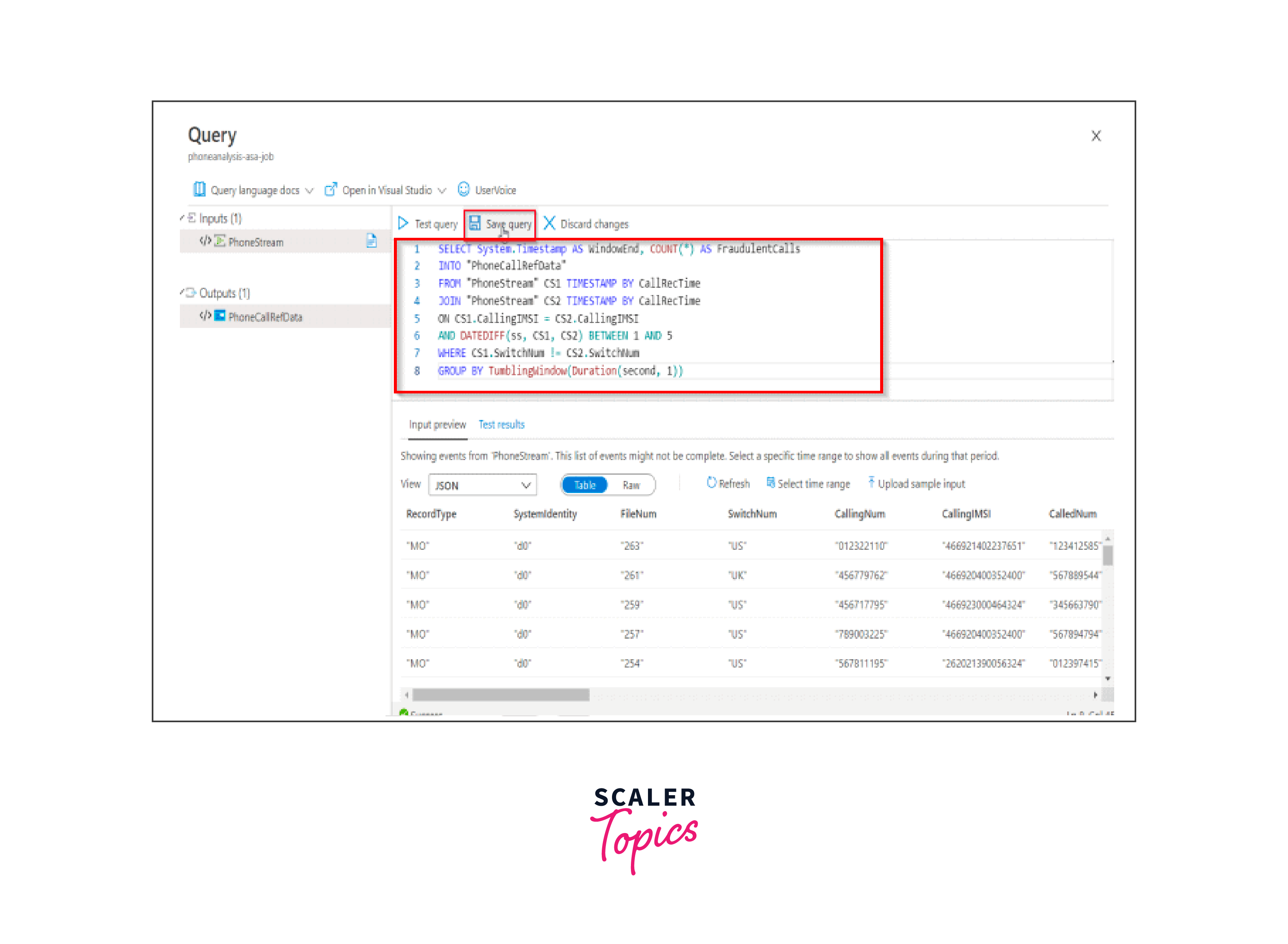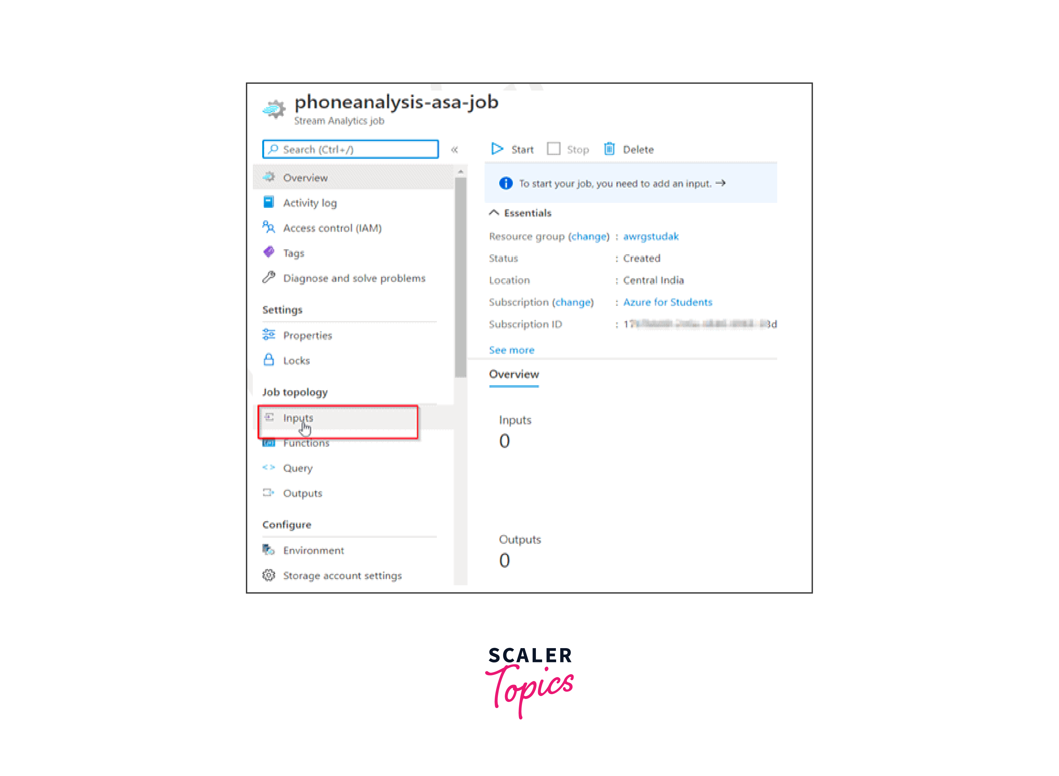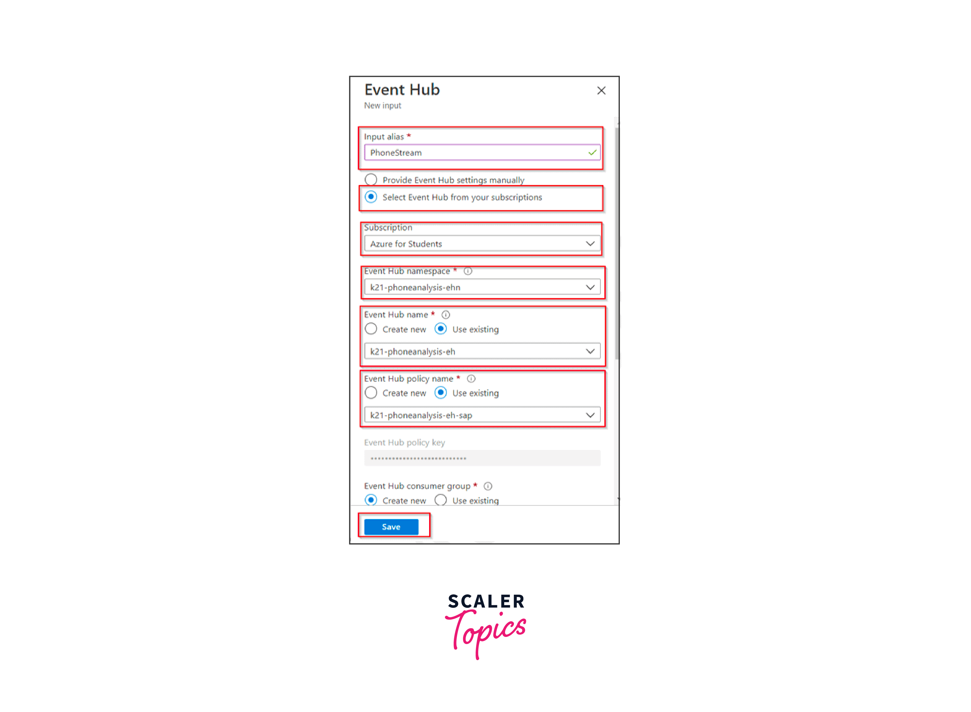 On the ensuing "Event Hub" page, input the requested details and hit "Save". Post-completion, you'll observe the "PhoneStream Input" job listed within the input section.