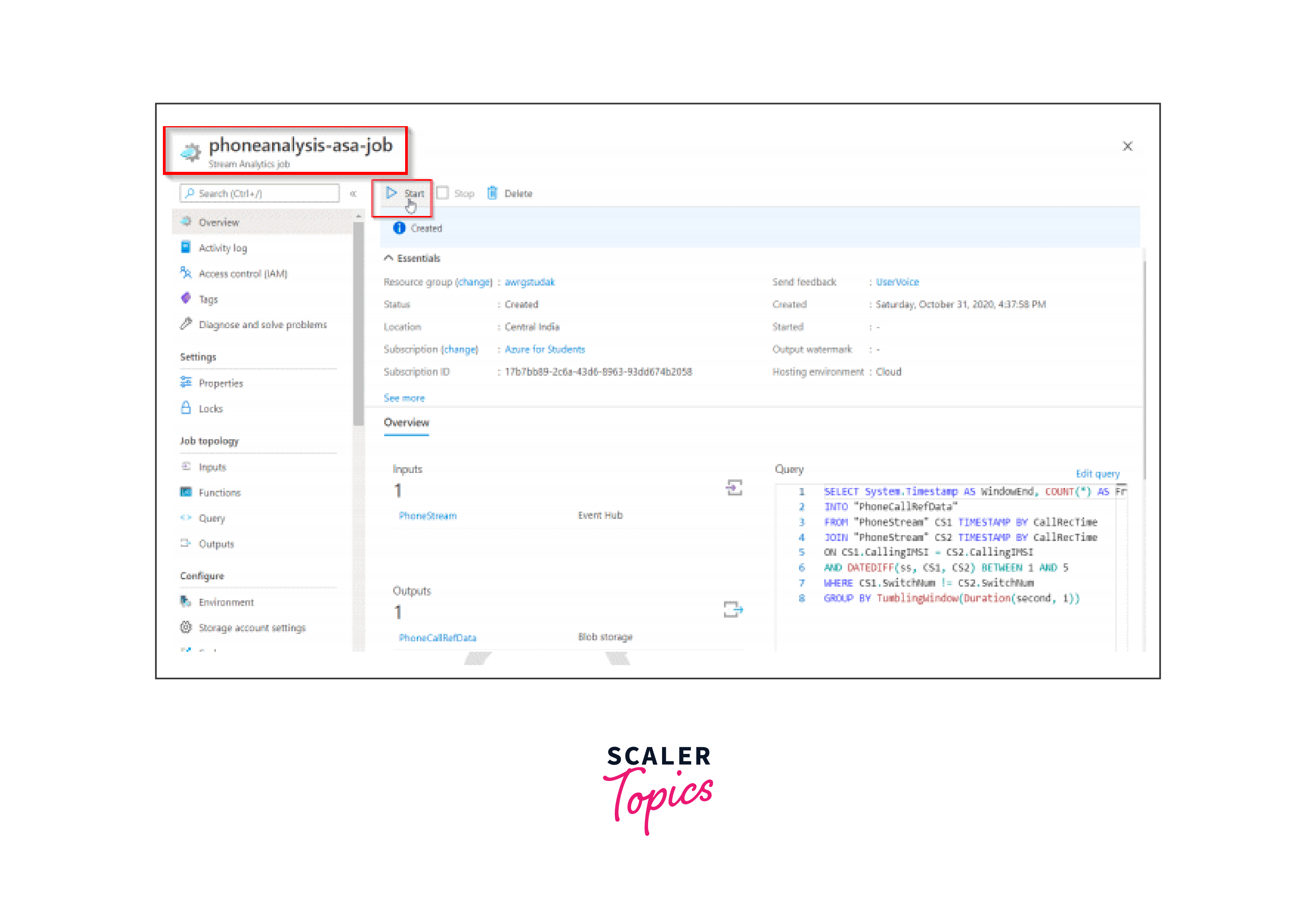 Within the same "Query" section, initiate the Stream Analytics job by selecting the "Start" button.