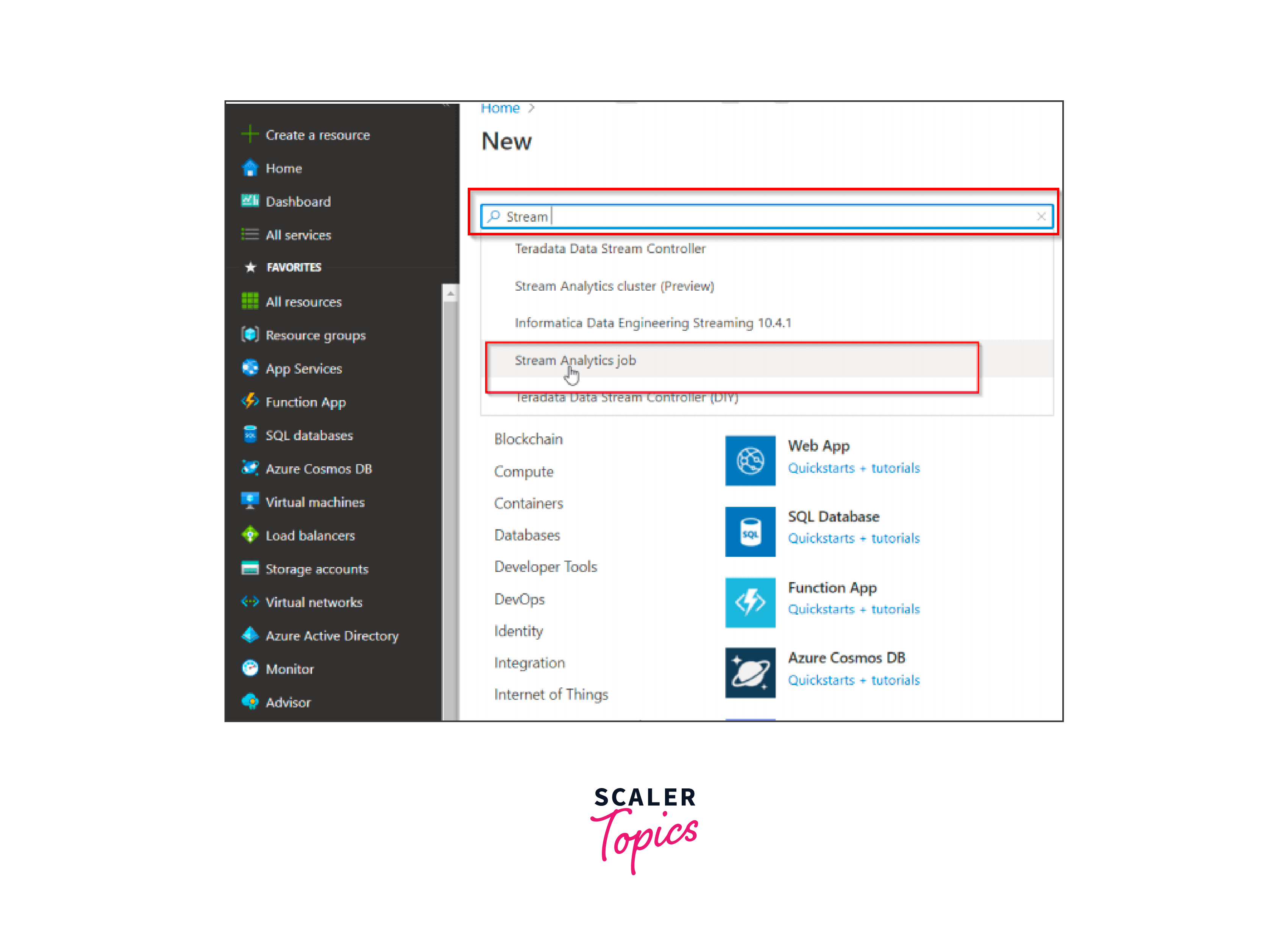 In the provided search field, input "Stream" or "Stream Analytics Job". Then, choose the "Create" option.