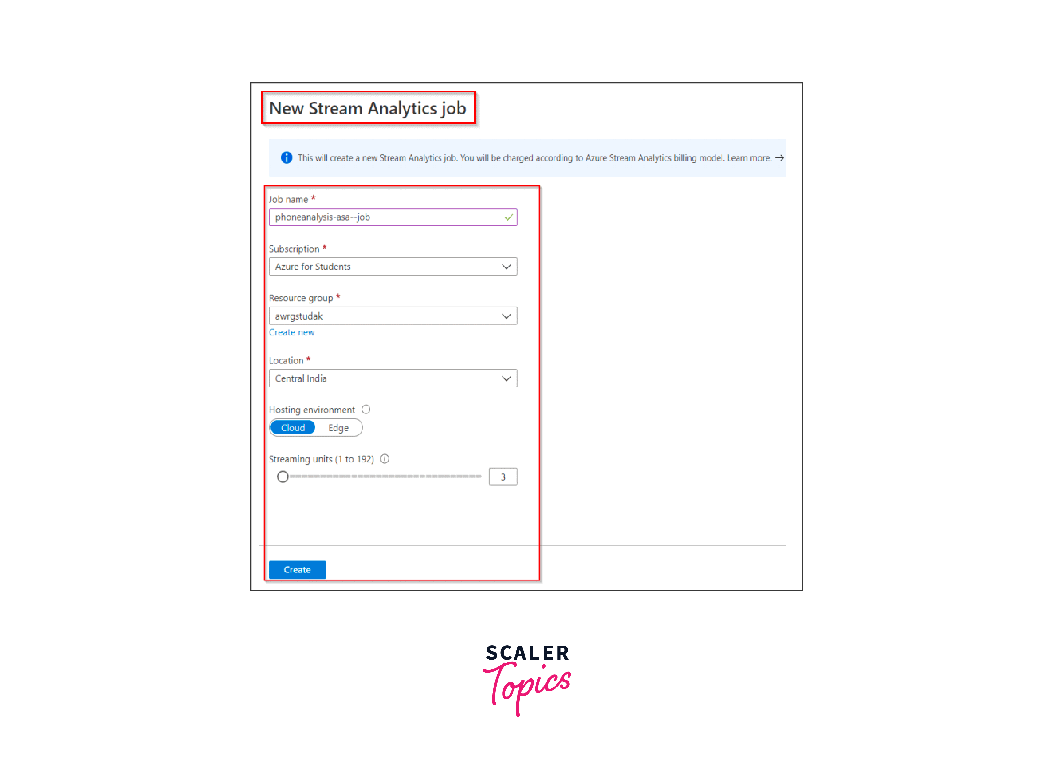 Within the "New Stream Analytics job" interface (note: if you don't have an existing resource group, you'll have the opportunity to establish one), provide the necessary details and select "Create".