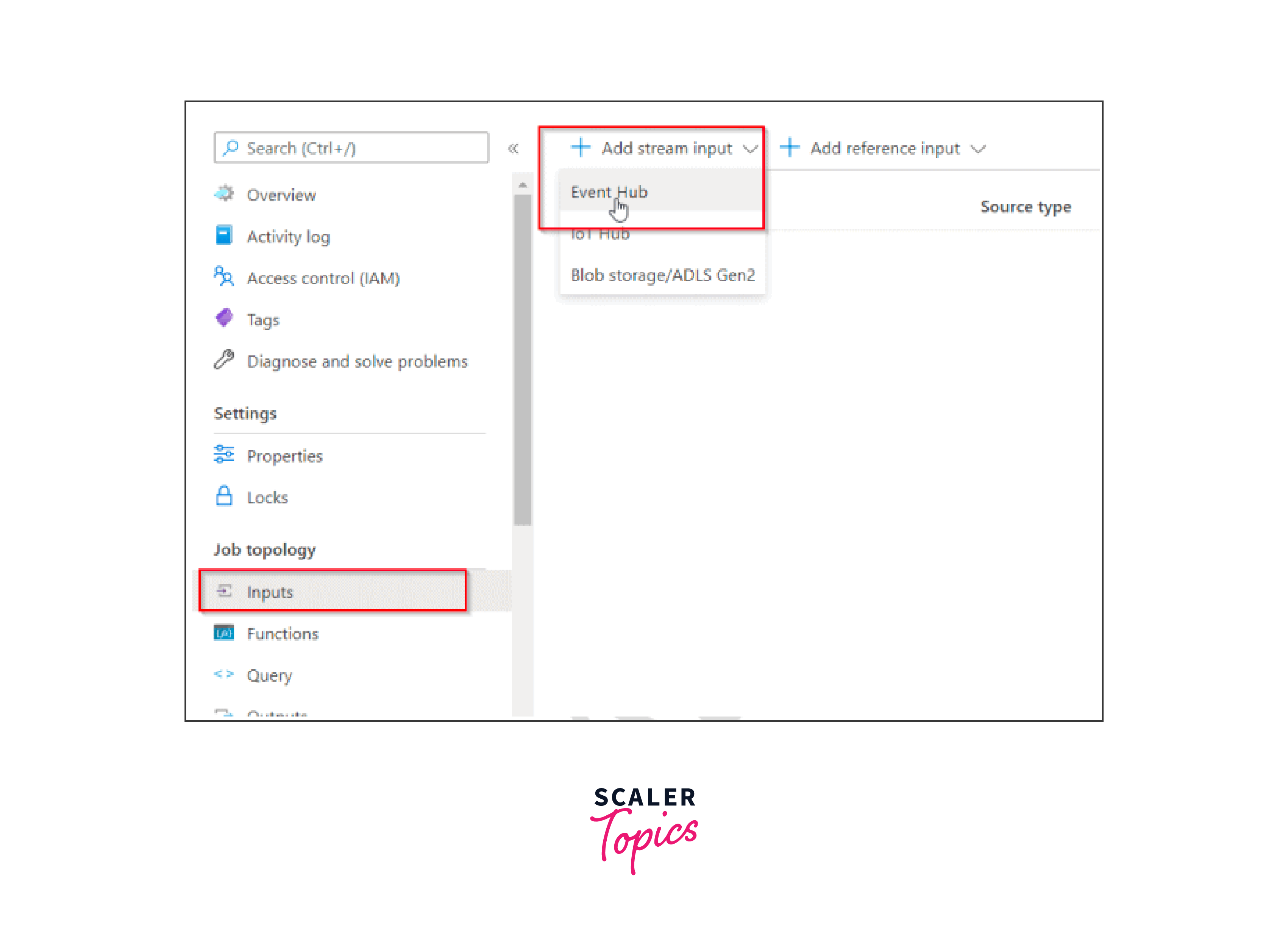 Within the "Inputs" section, hit "+ Add stream input" and then select "Event Hubs" (an extensive data streaming service capable of managing numerous events simultaneously).