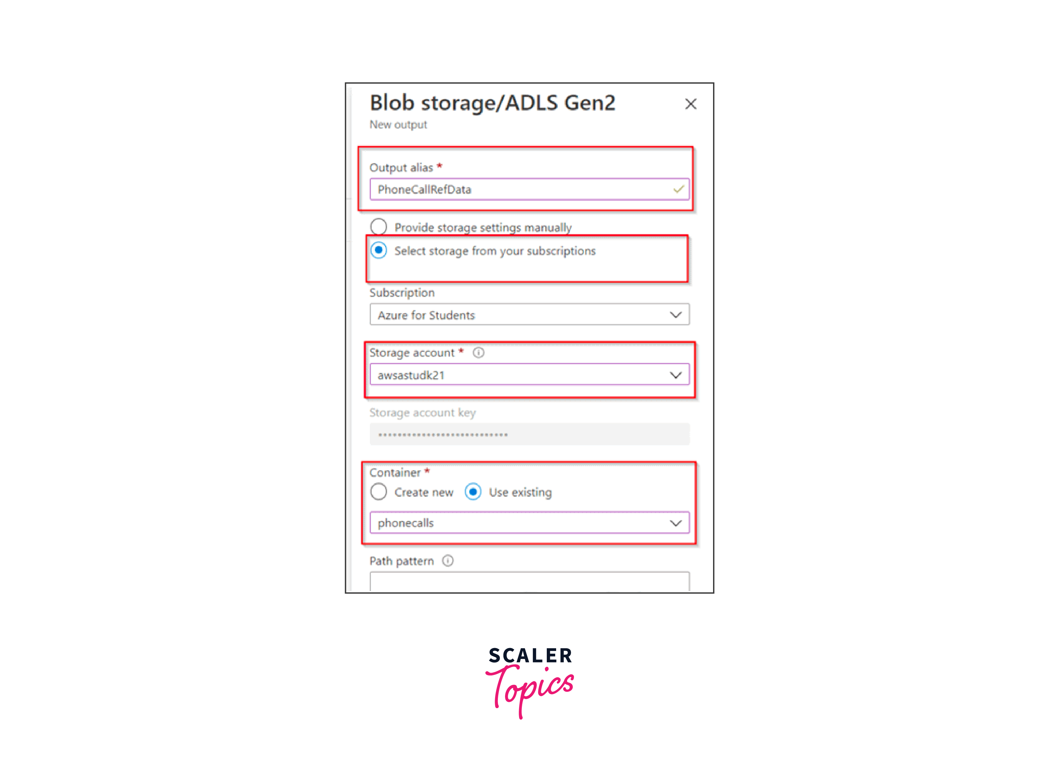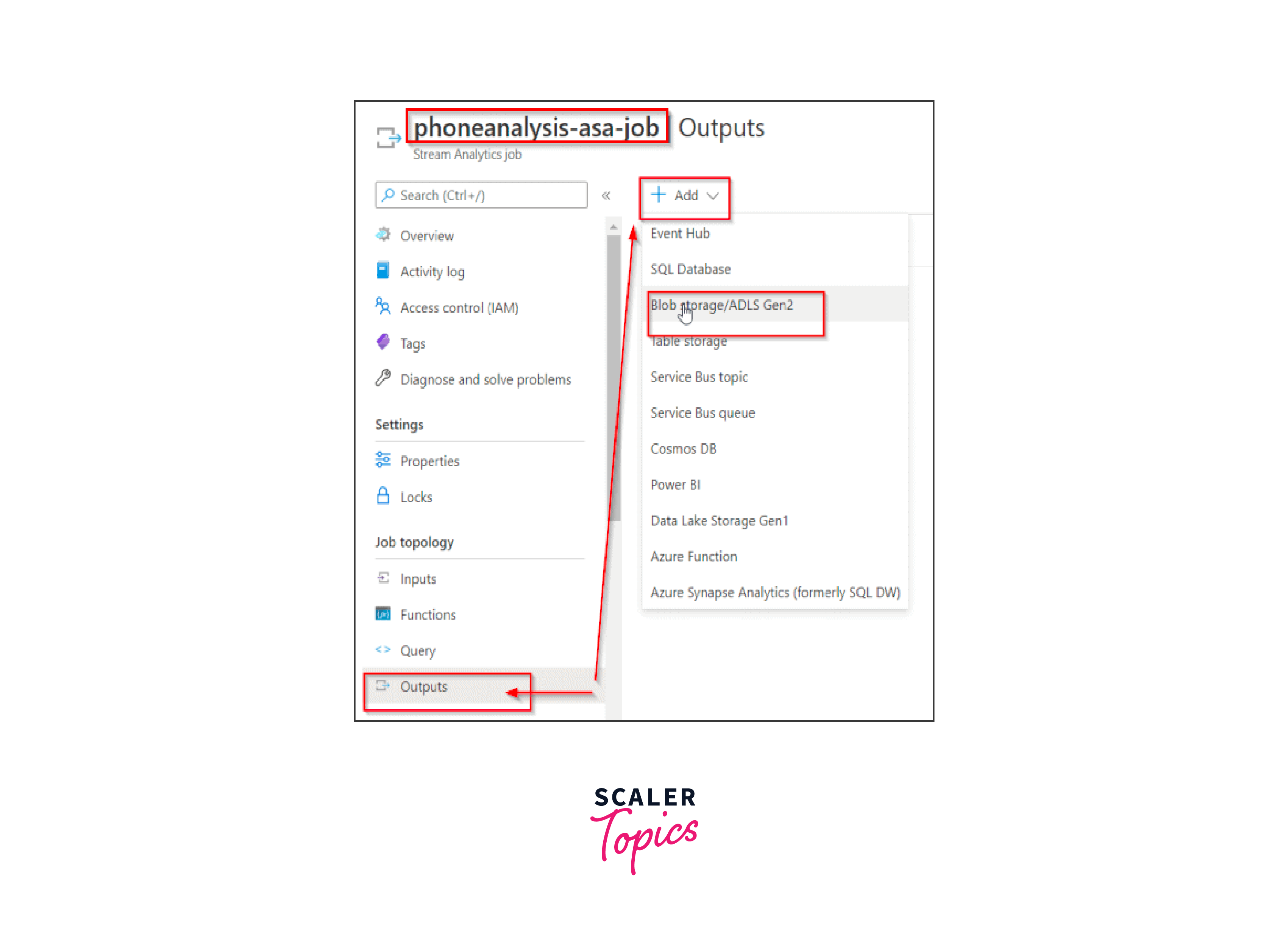 Navigate again to the "phoneanalysis-asa-job Stream Analytics job" section. On the left sidebar, under the "Job topology" category, opt for "Outputs" to determine the outputs for the Stream Analytics job. Then, choose "+ Add" followed by "Blob Storage".