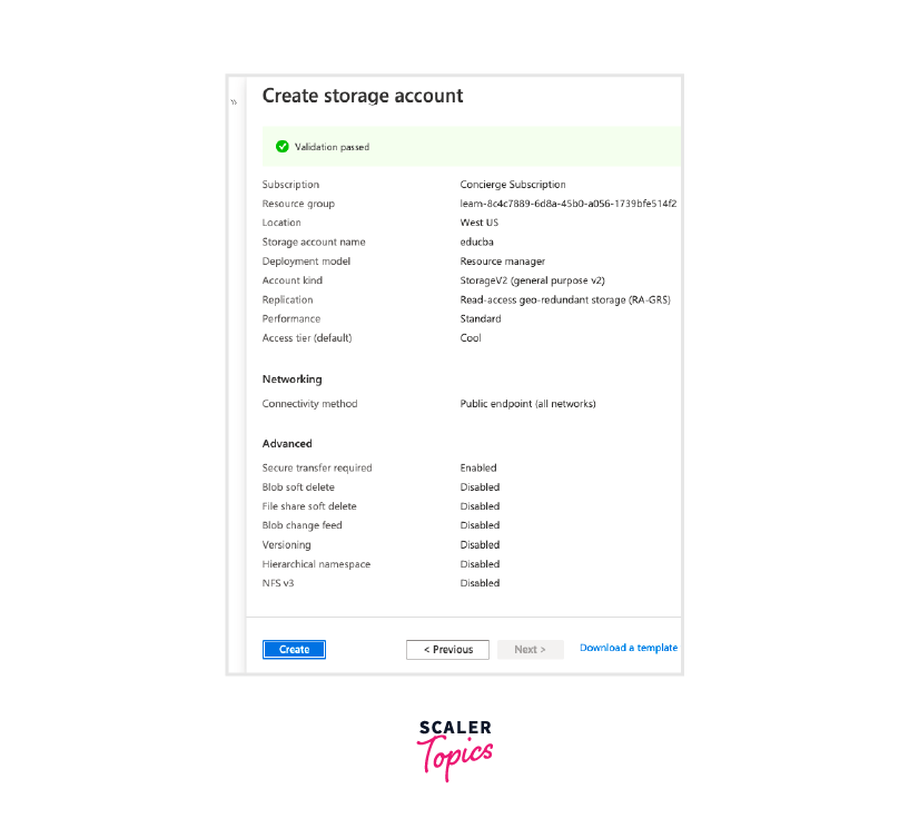 Step 6: Create the Storage Account: After the validation is successful, click "Create" to start the creation process. The storage account creation may take a few minutes to complete.