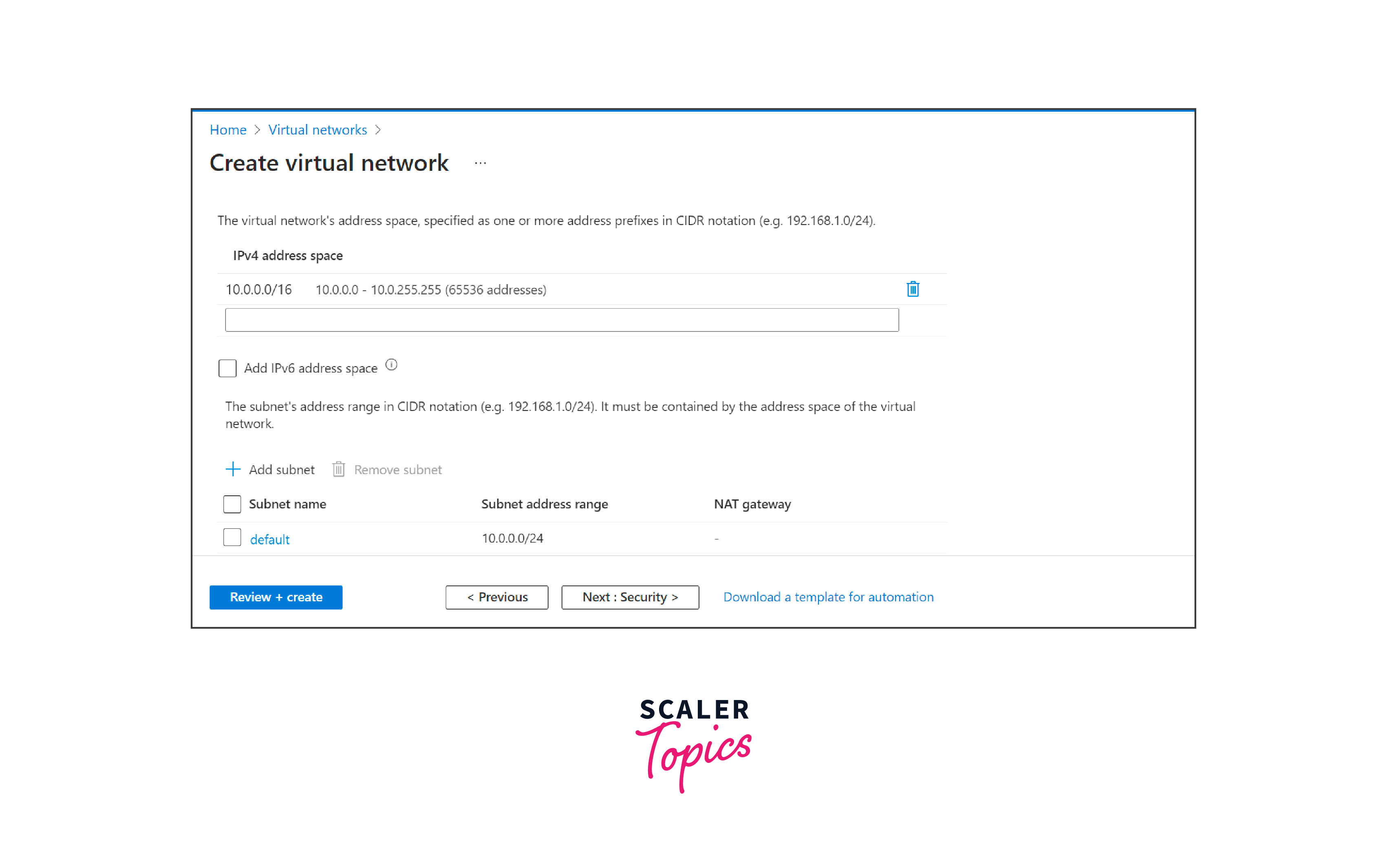 Create a subnet within the VNet, providing a name and its IP address range (e.g., 10.0.0.0/24). - Click on Review + Create to create the Virtual Network.