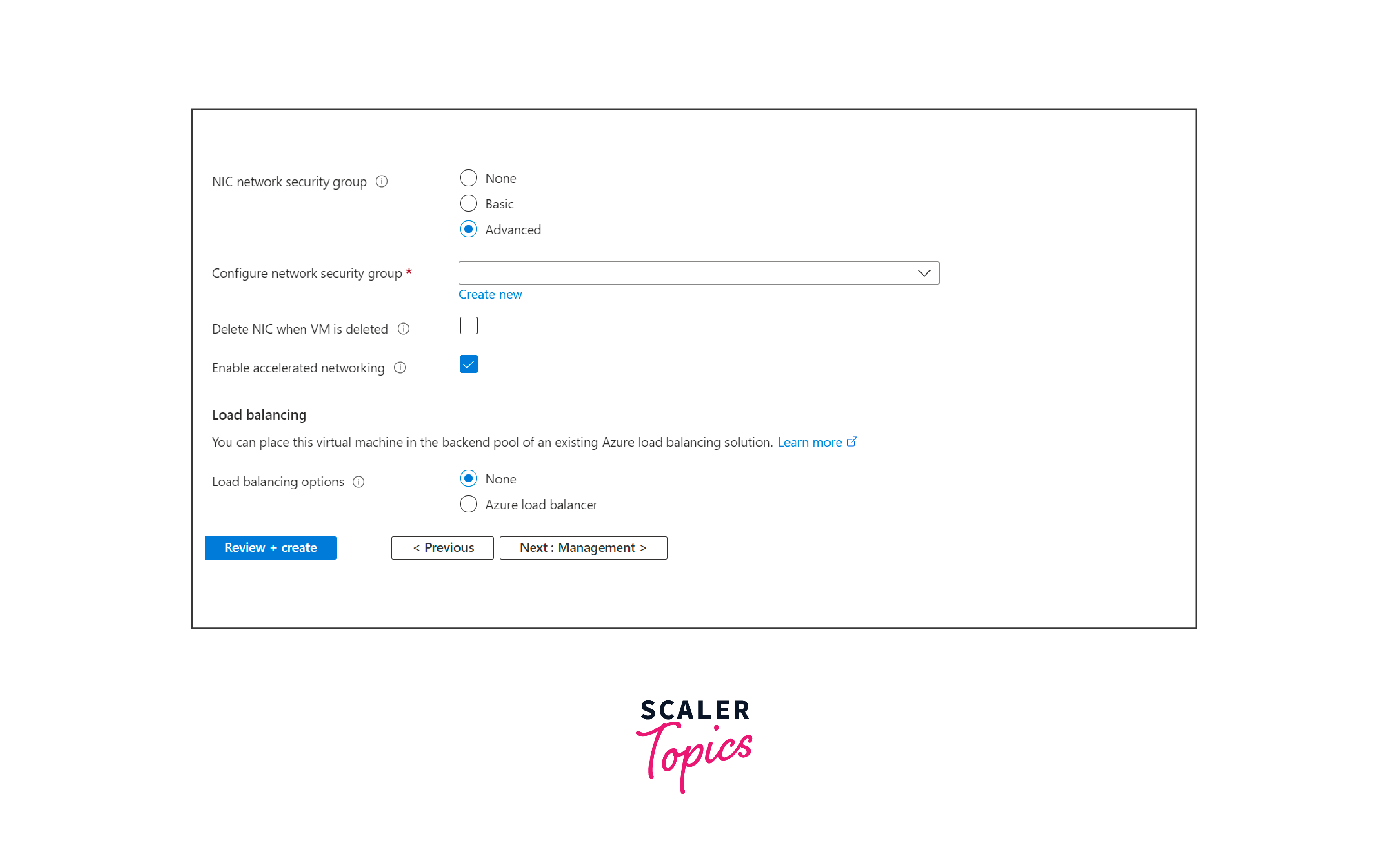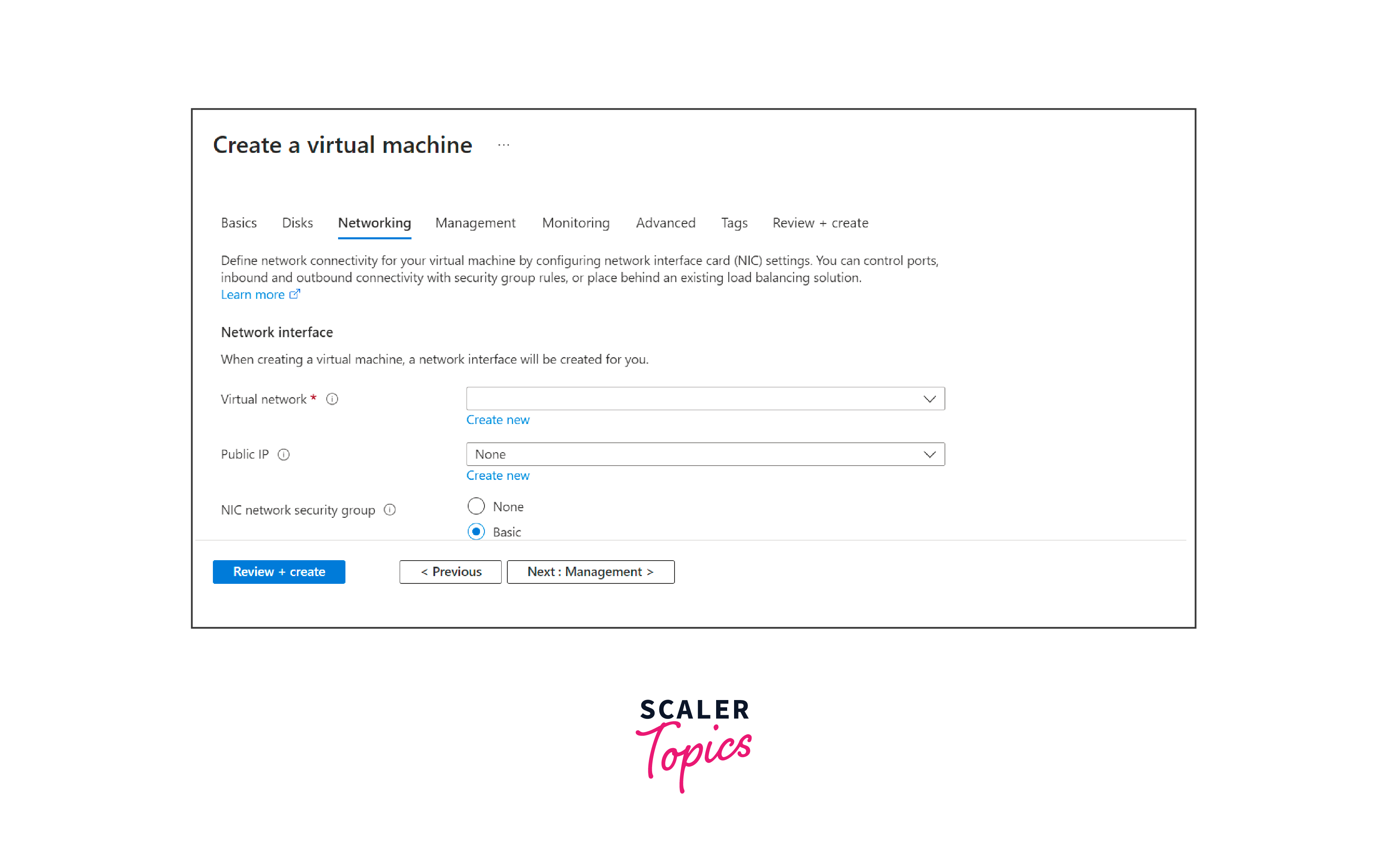 In the Networking tab, select Virtual network and choose the VNet and subnet you created earlier.