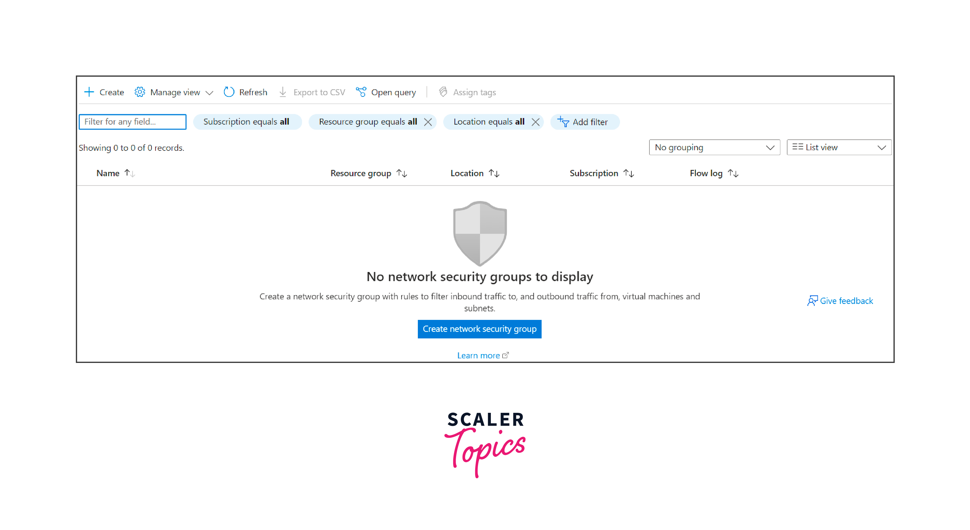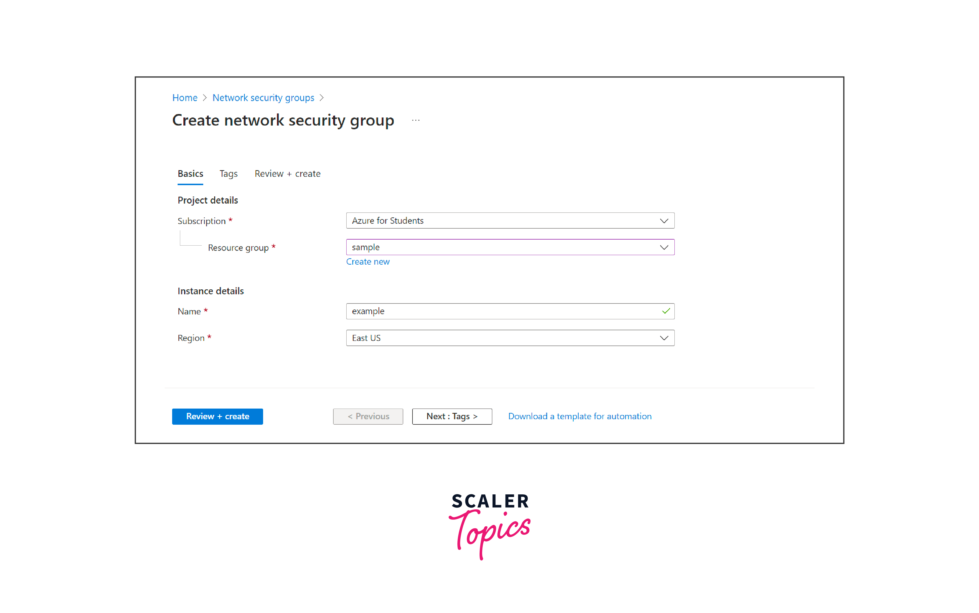 Click on Create and fill in the required details for the NSG, such as name, subscription, resource group, and region, and click Create.