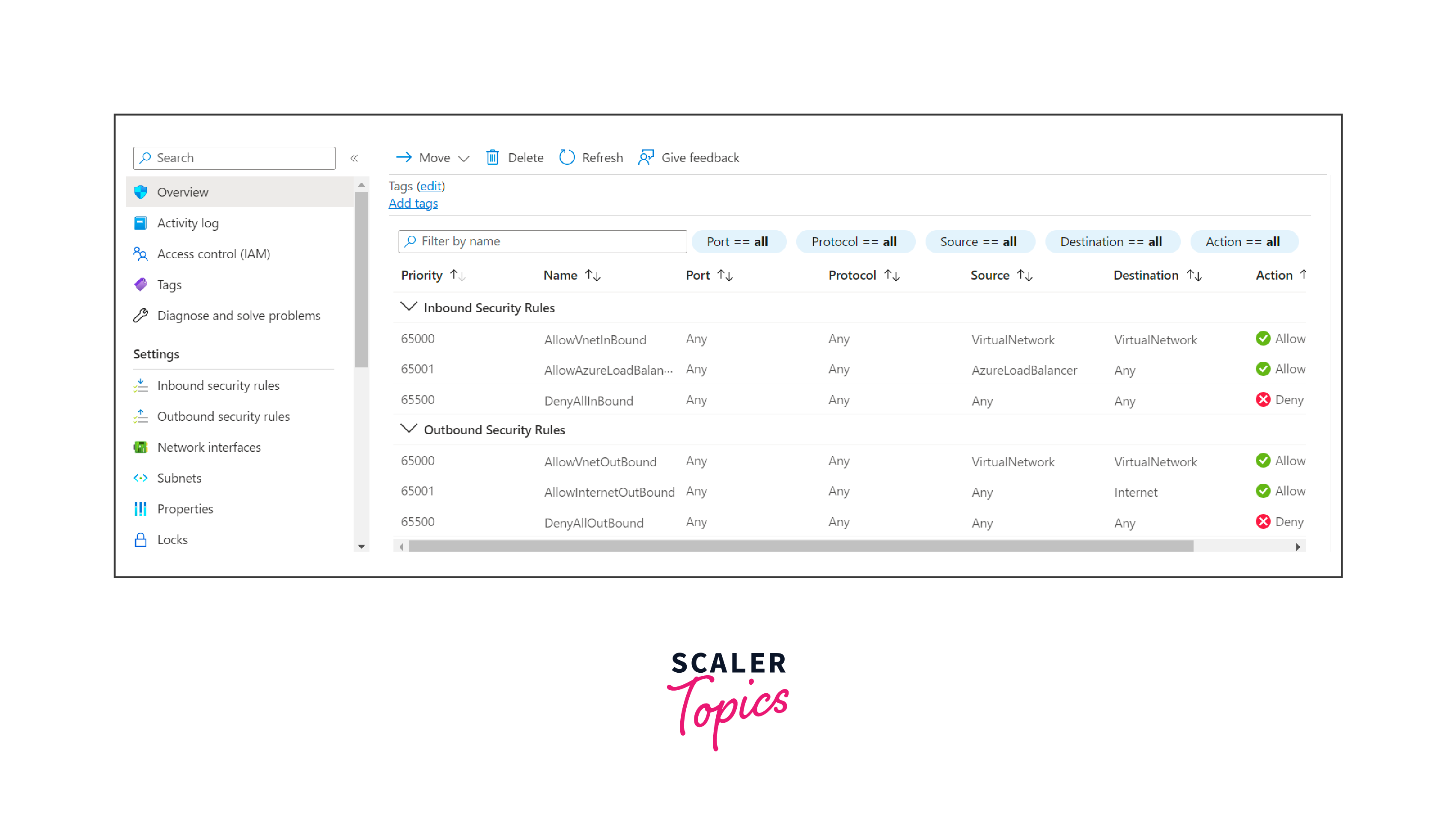 Allow users to further divide the address space of a VNet into smaller segments, each with its range of IP addresses. For example, a VNet can have subnets for web servers, application servers, and databases, each with its unique IP address range. - Network Security Groups (NSGs):