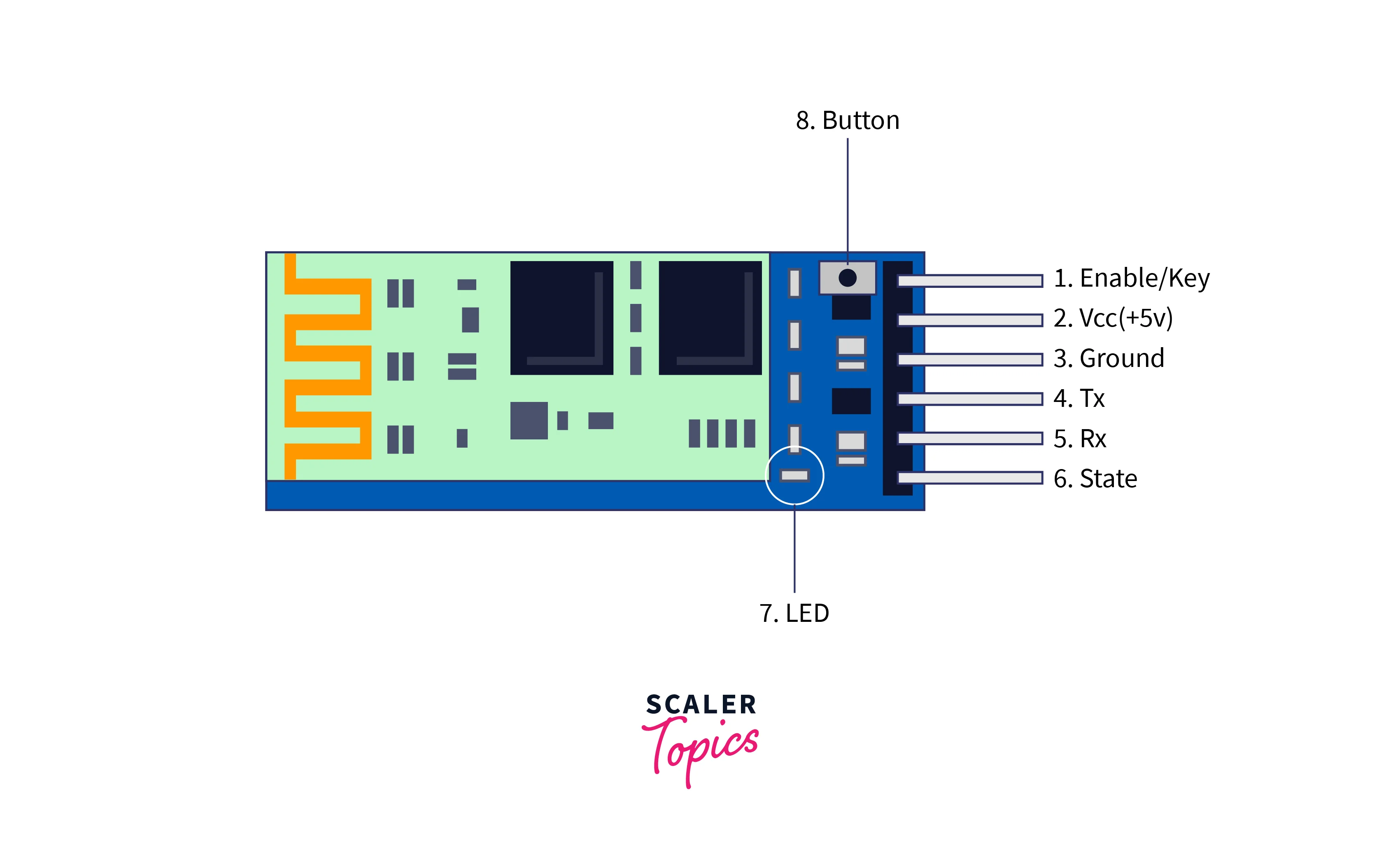 - LED Indicator Pins: HC-05 modules often have two LEDs, one for power (PWR) and one for status (LED). These LEDs provide visual feedback about the module's operation. The PWR LED typically lights up when the module is powered, while the LED indicator may blink or change colours to indicate different states like pairing or data transmission.