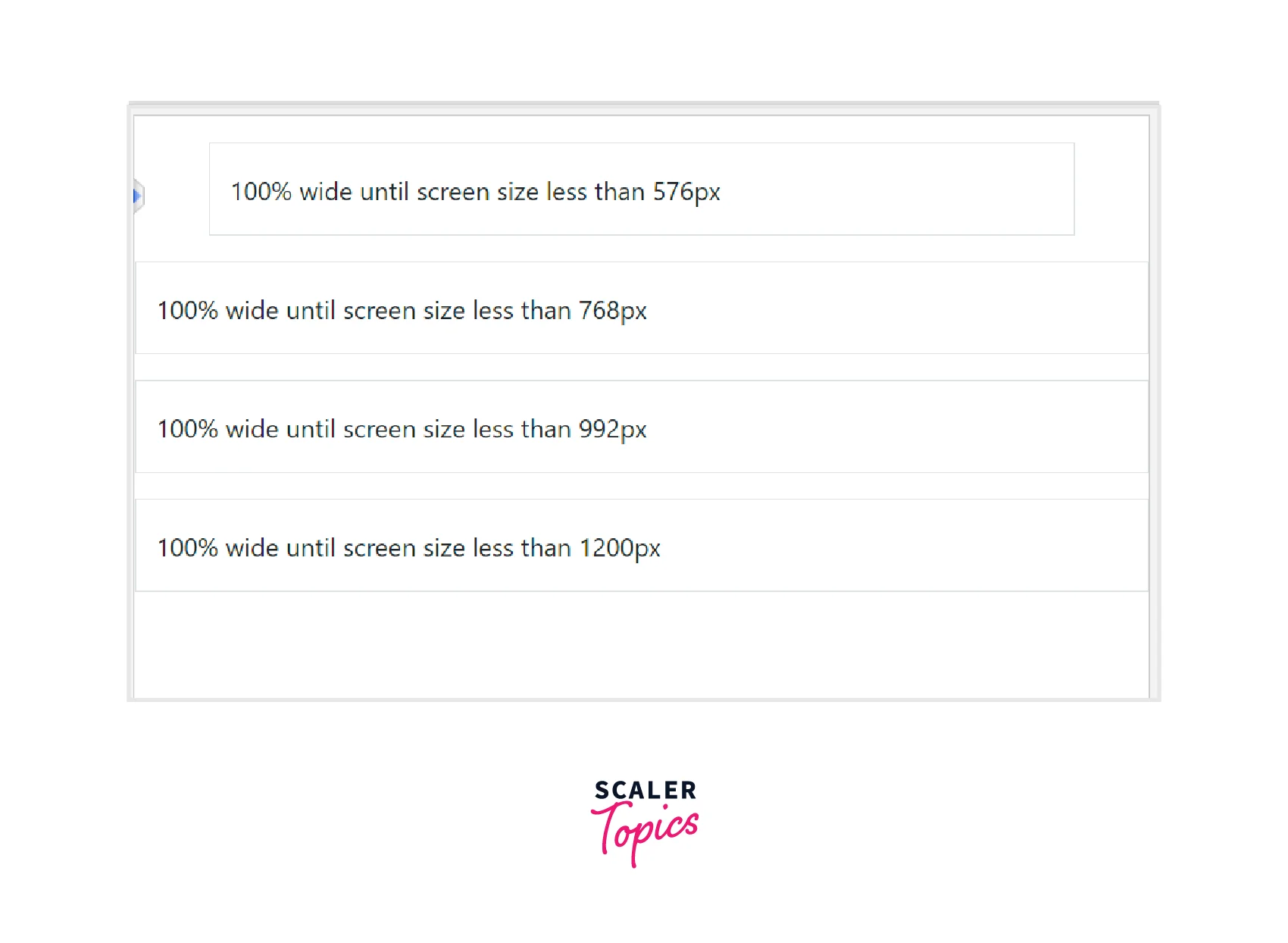 - For example, .container-md is 100% wide to start until the md breakpoint is reached(viewport width ≥ 992px), where the container will scale up with md, lg, xl, and xxl.