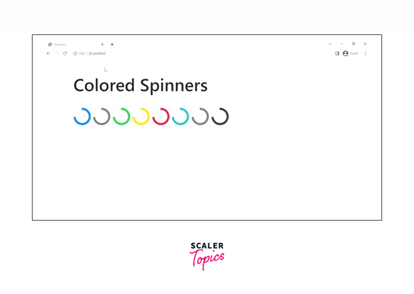Therefore, as you can see in the output, the different color spinners have been created using the corresponding bootstrap utilities. Moreover, only the corresponding text-color class is used with the .spinner-border utility to give the spinner a particular color.