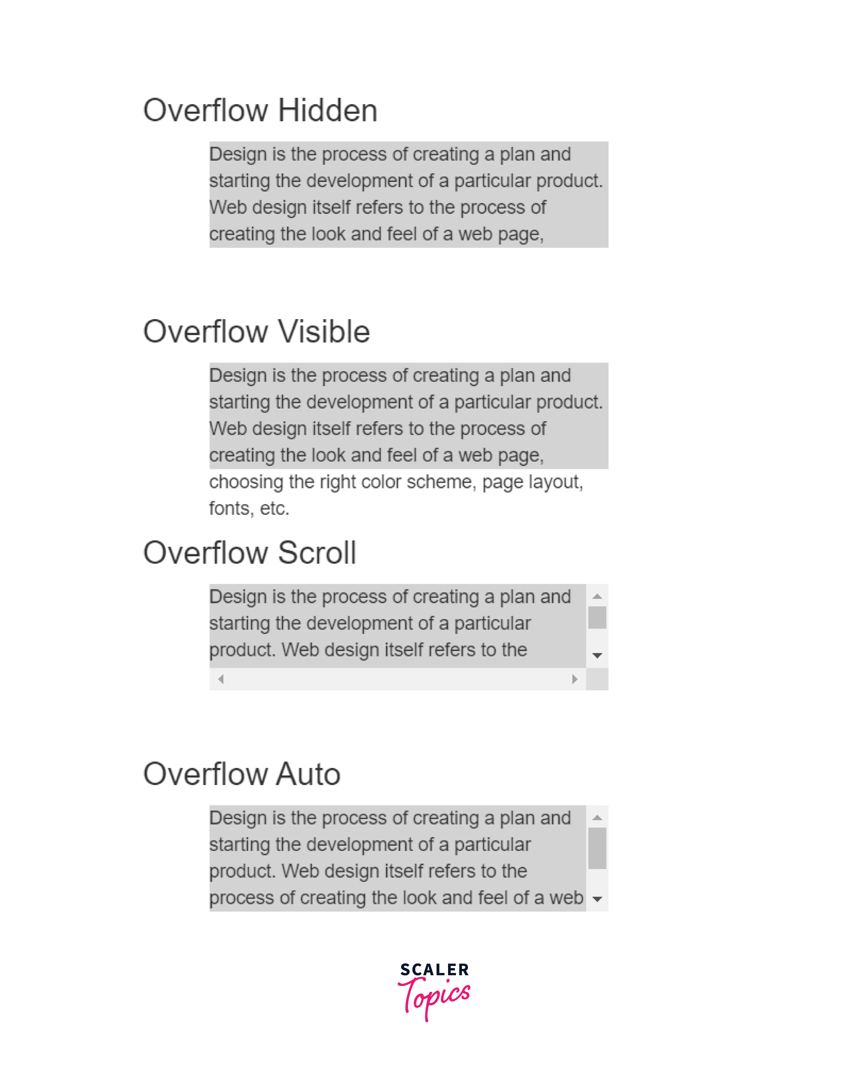 As seen in the example above, the overflow-hidden hides the remaining content, the overflow-visible shows the content outside its container too, and the overflow-scroll adds a vertical scrollbar so that the user can scroll down to the rest of the content, and overflow-auto automatically adjusts the content in the container by adding a scrollbar.