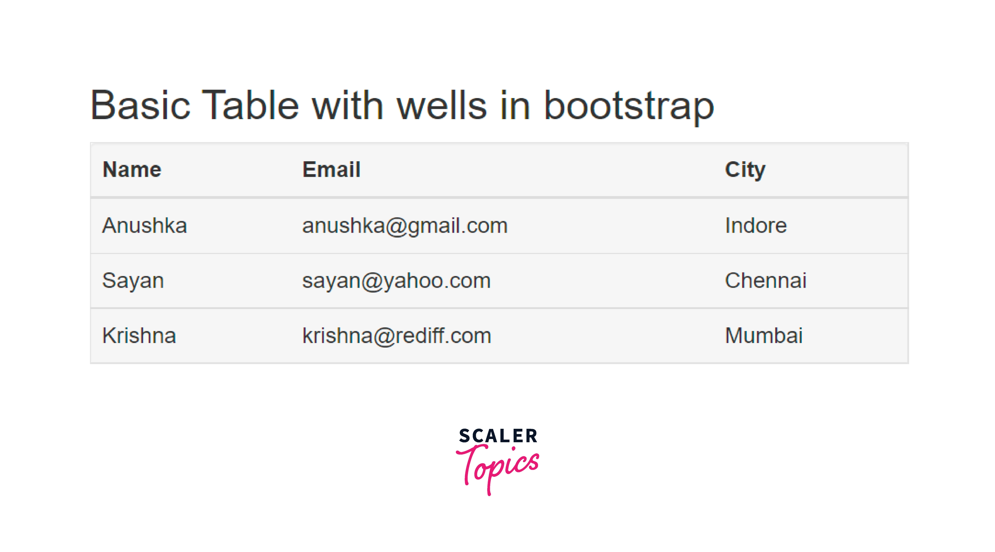 We can use wells with the bootstrap table. The border and space between each row and column of the table are controlled by the .well class. The following example illustrates a basic table with wells in bootstrap: