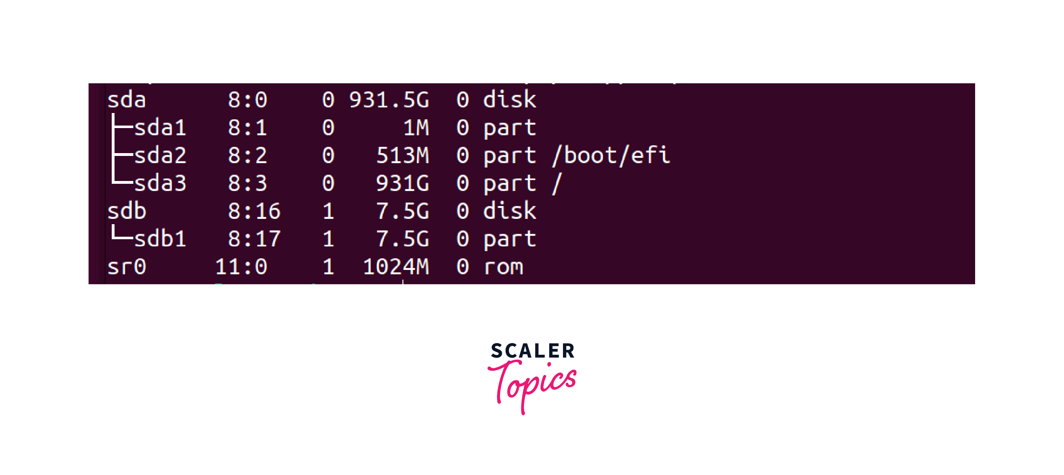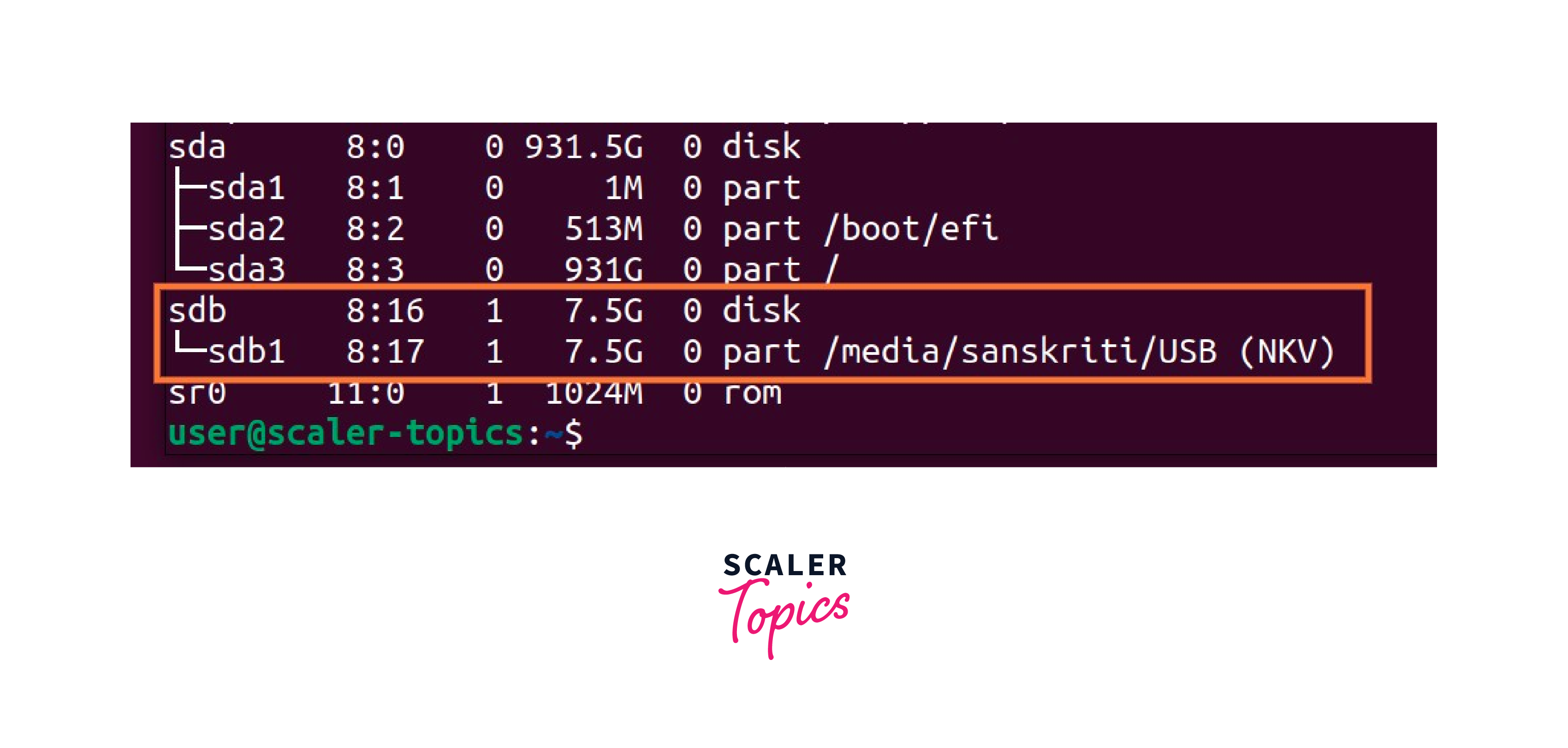 - This command lists all block devices and helps identify your USB drive. It's typically named /dev/sdb1 or similar.