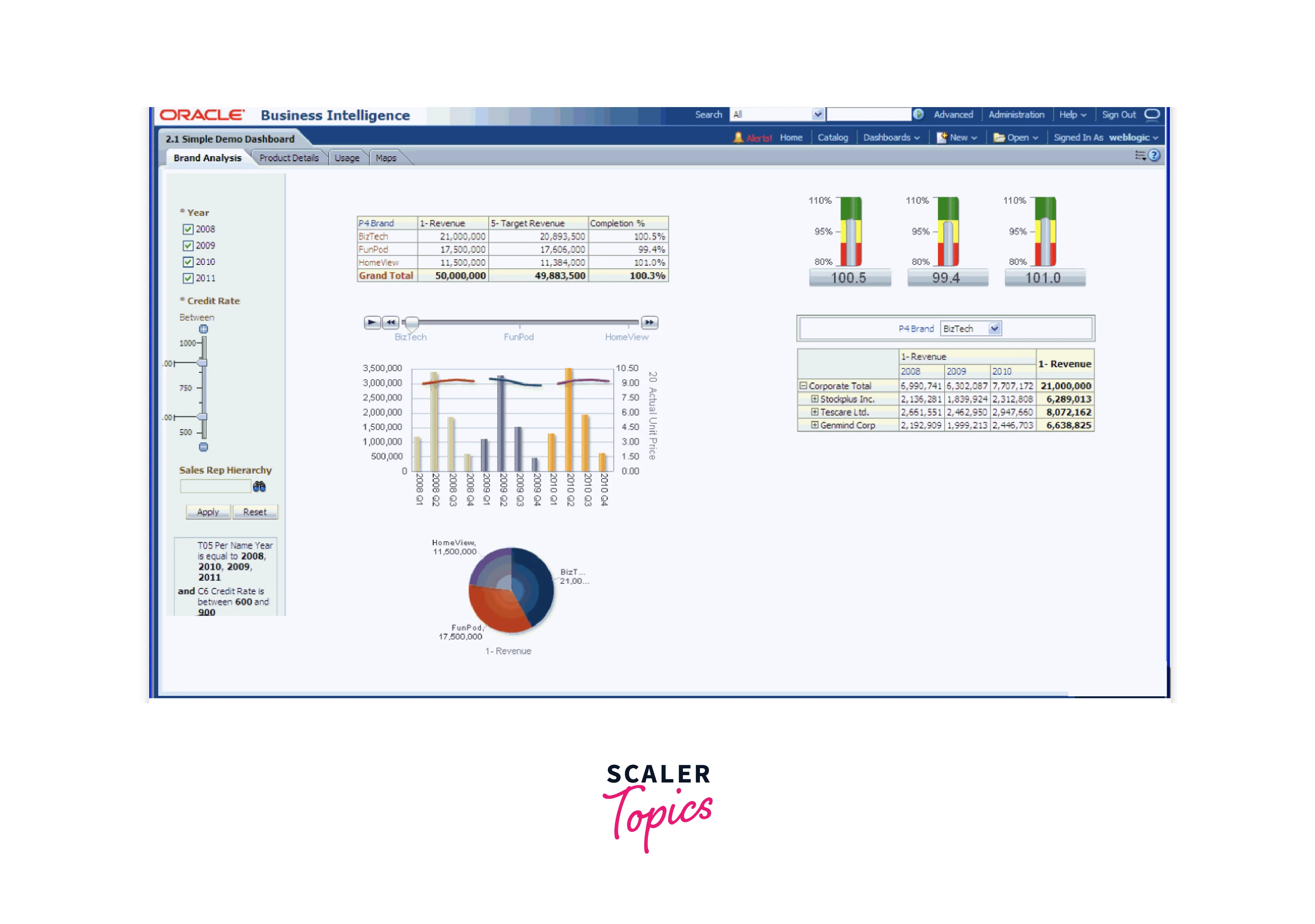 Another widely popular business intelligence tool is Oracle BI offering its portfolio of technology and applications. Offering its users all the business intelligence capabilities, like proactive intelligence, dashboards, ad hoc, etc. Organizations dealing with huge amounts of data from Oracle or any non-Oracle data sources with its robust solution. Additional features include versioning, data archiving, and the self-service portal with its set of alerts/notifications. You can explore more on its website at the link Oracle BI