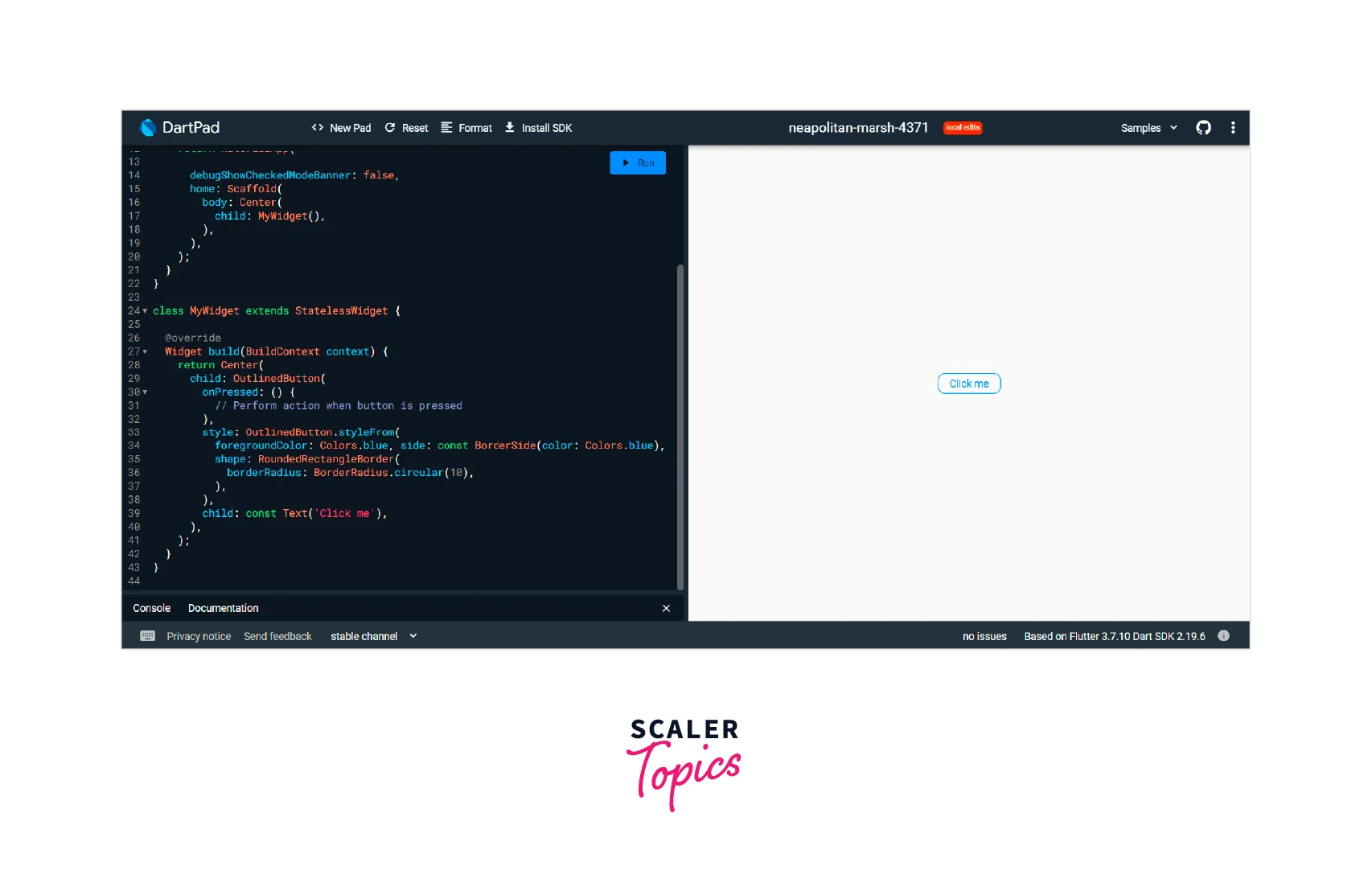 - In this example, we create an OutlinedButton widget with blue text and a blue border outline`. We also set the border-radius property of the ButtonStyle to give the button a rounded border.