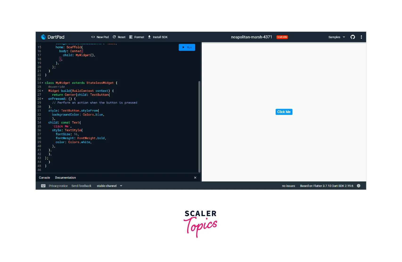 - In this example, we create an InkWell widget with a child widget that displays the text "Click me". When the user taps on the button, the onTap function is called, and the action associated with the button is performed.