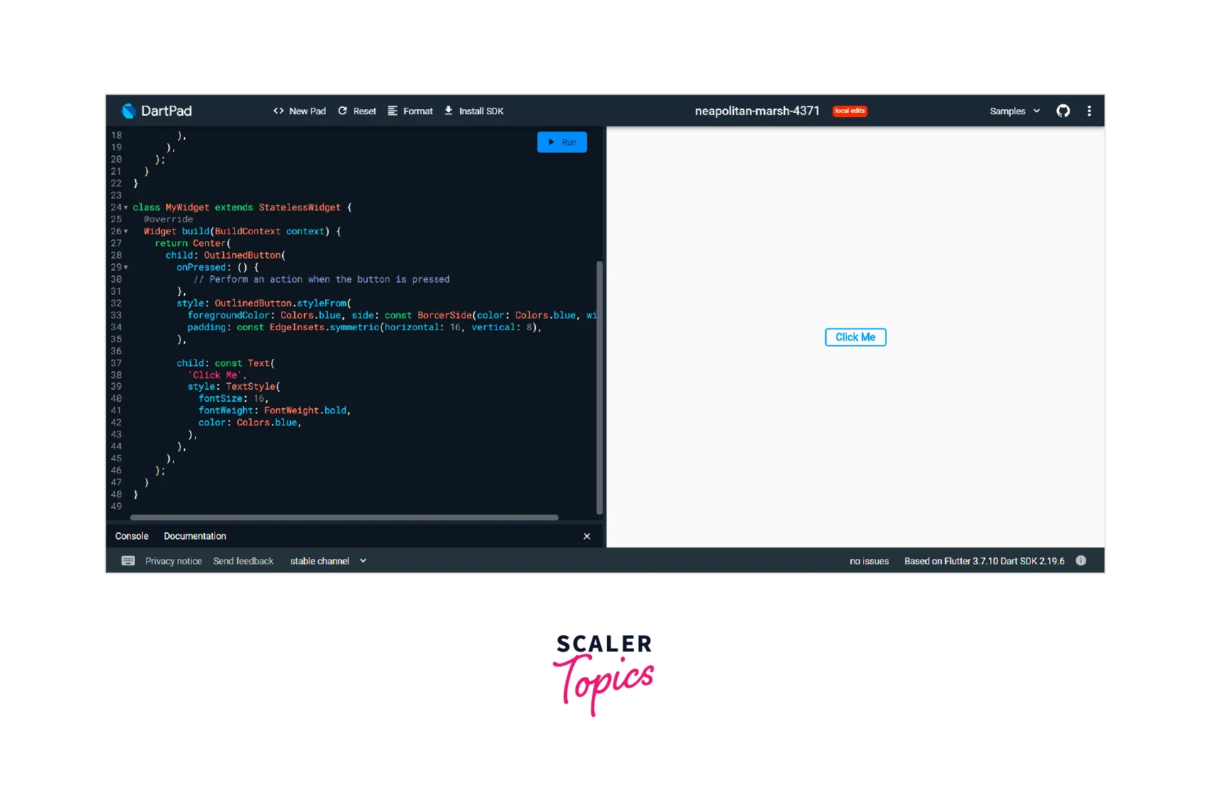 - Here's an example of how to create an OutlinedButton widget in Flutter: