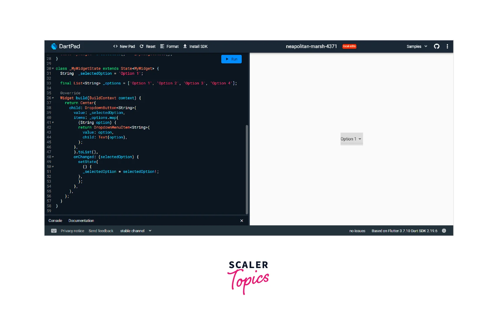 - In this example, we create a DropDownButton widget that displays a list of options in a dropdown menu. The currently selected value is set to "Option 1", and the list of options is defined in the _options variable. When the user selects a new option from the dropdown menu, the _selectedOption variable is updated, and the setState() function is called to update the state of the widget.