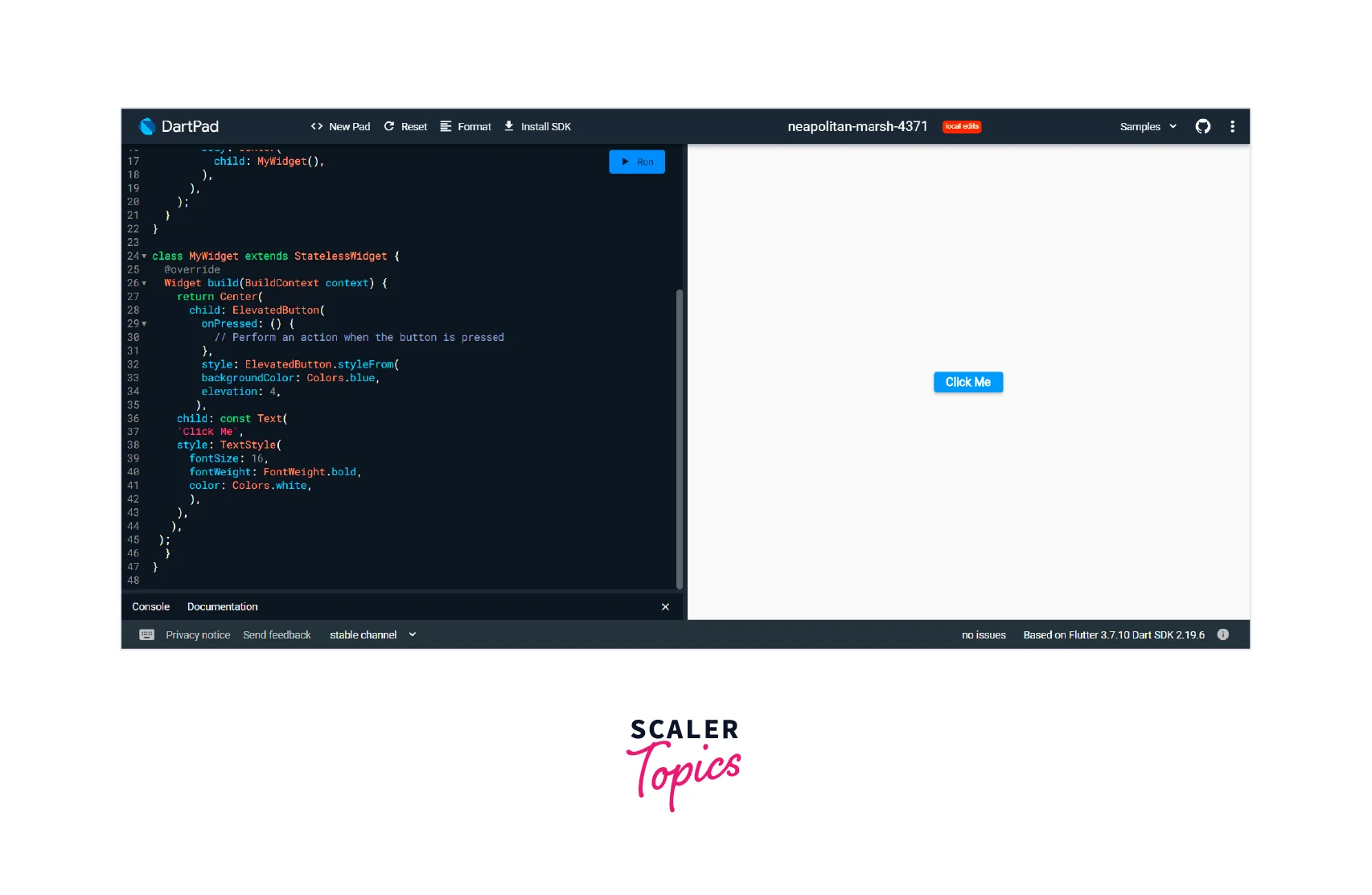 - Here is an example of how to create an ElevatedButton widget in Flutter:
