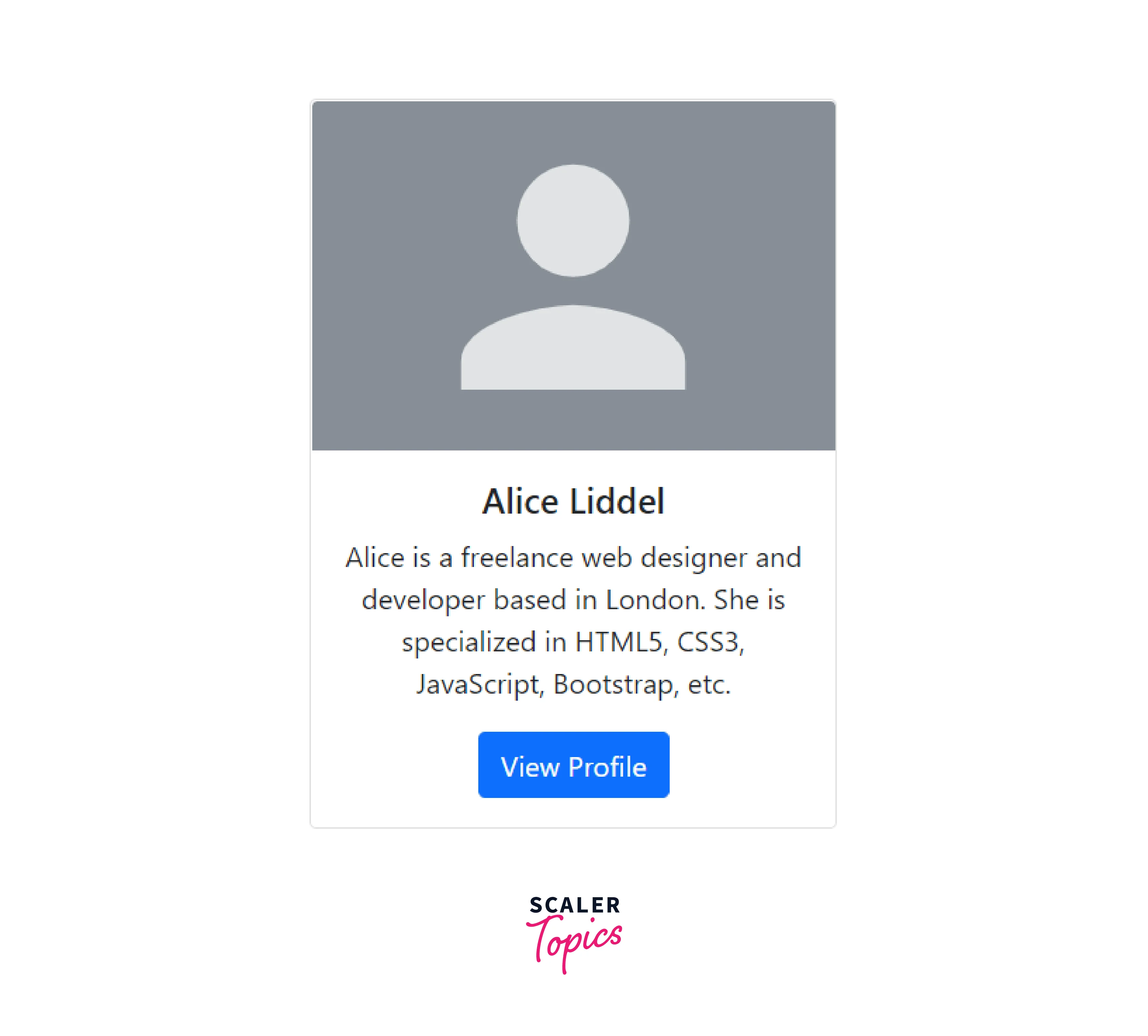 - In the right column, there's a card body with a title (Alice Liddel), a short description, and a button (View Profile).