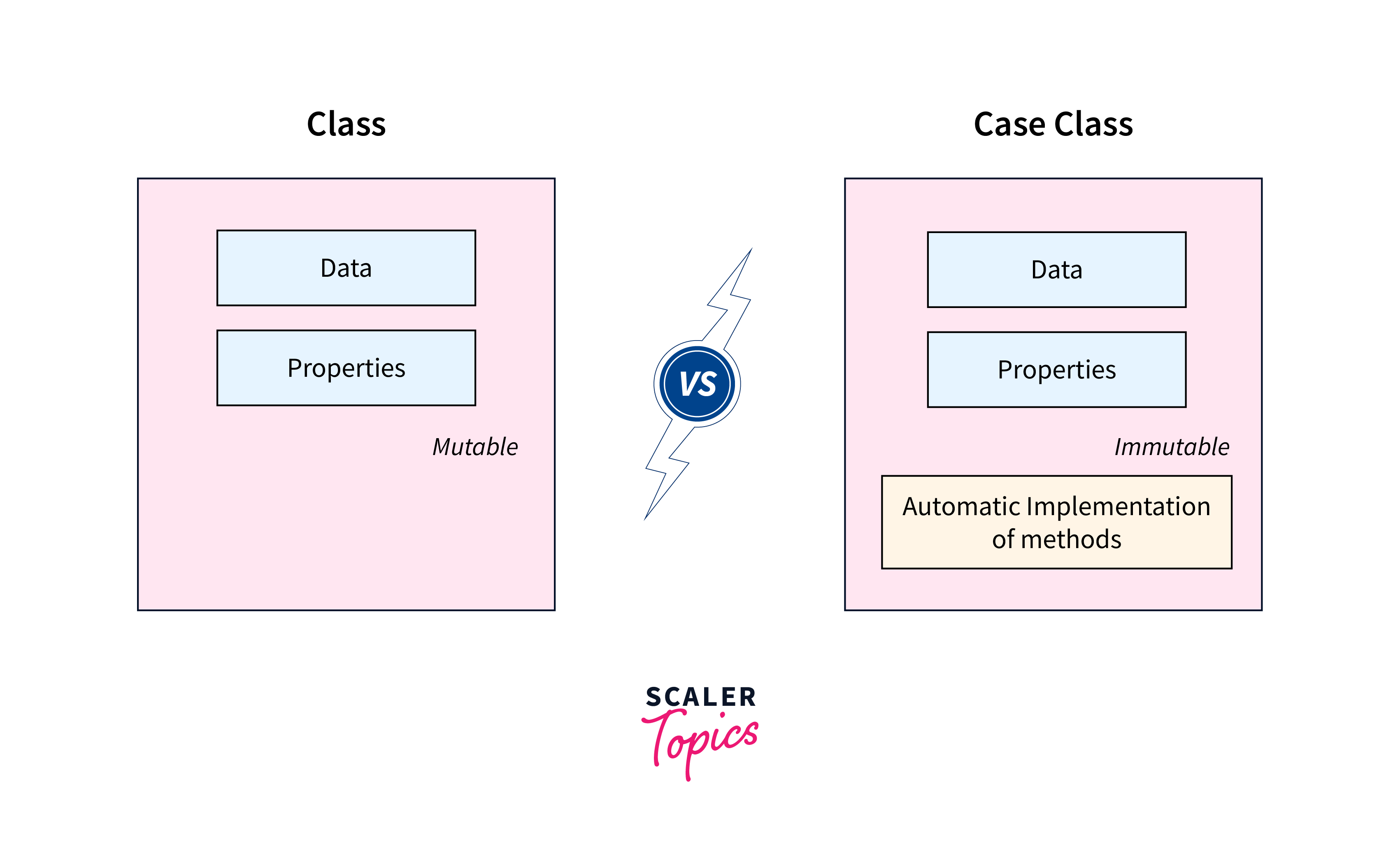 - A class in Scala requires manual implementation of common methods and is mutable by default, while a case class in Scala generates methods like equals, hashCode, and toString automatically, is immutable by default, and excels at concise data modeling.