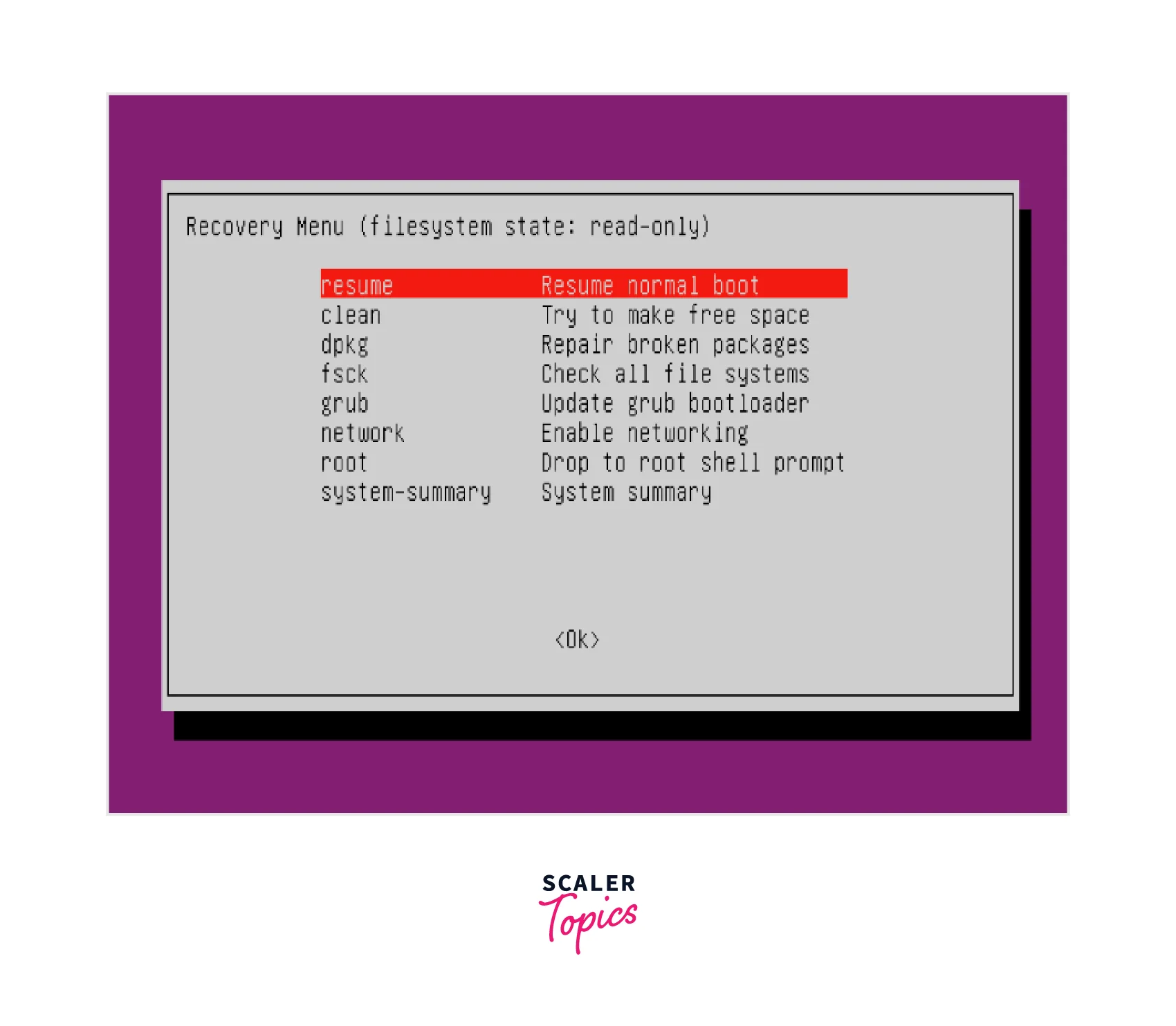 In the boot configuration, select the Recovery option for your system, in this case, we are using the Recovery menu for Ubuntu:
