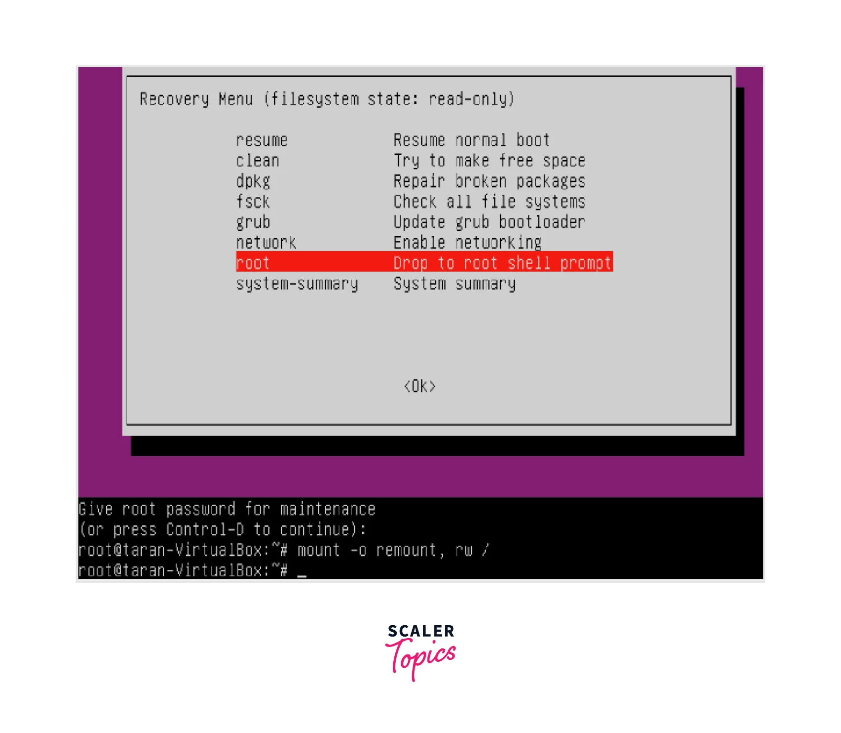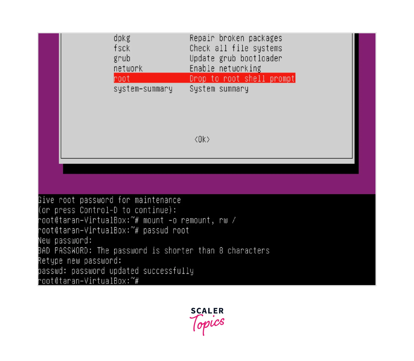 Now, select the root option in the menu and press enter for getting the terminal to change the password