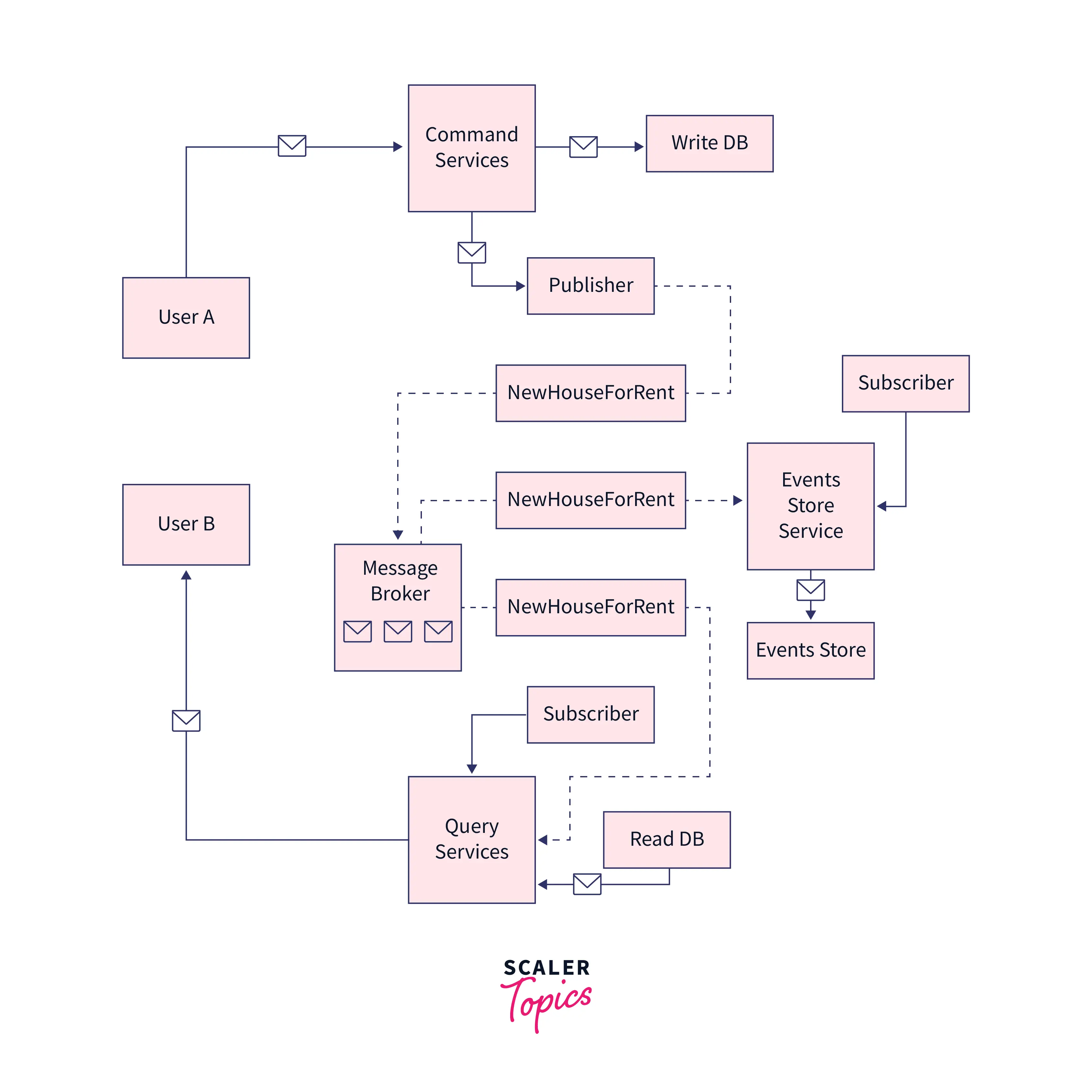 Explanation: In the above diagram, there are 2 different users A and B. User A makes a write query to add a new house to the application and User B makes a read query to view/get all the houses that are present in the application. When User A adds a new house, it gets added to the Write DB, and simultaneously, the new house information is also published to a Messaging Queue, so that it can be consumed by Query Data Handler Service, which is a Subscriber of the Queue Topic NewHouseForRent. The message after being received by the Query Service is written to the Read Database, so that the next time, this gets served to all the read requests, which in our case is User B, as of now. Also, this message has been logged to the Events Store Database using the Events Store Service which is also a Subscriber of the Queue Topic NewHouseForRent.